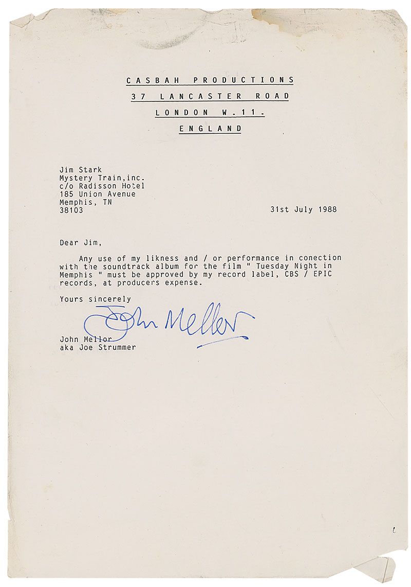 DS, signed “John Mellor,” one page, 8.25 x 11.75, July 31, 1988. Strummer informs Mystery Train, Inc. that use of his “likeness and/or performance in conection [sic] with the soundtrack album for the film ‘Tuesday Night in Memphis’ must be approved…by CBS/Epic records.” Signed at the conclusion by Strummer, using his legal name. In very good condition, with scattered creases, soiling, and small tears to top and bottom edges, and an area of dampstaining to the upper right.
