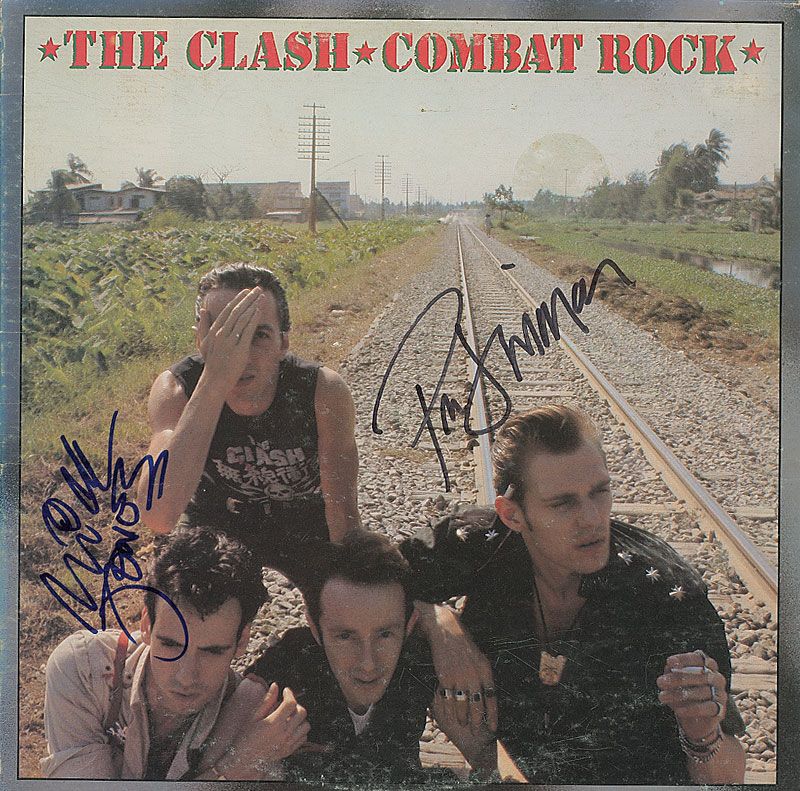 Combat Rock album signed on the front cover in blue felt tip by Mick Jones and in black felt tip by Paul Simonon. In fine condition, with a couple label and adhesive remnants to front cover, and some light wear and rubbing to both covers. The record is not included. Accompanied by a letter of authenticity from James Spence.
