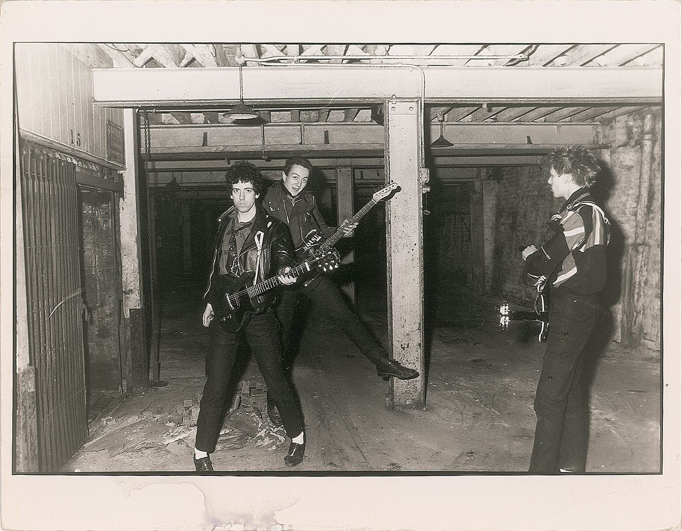 Early original vintage semi-glossy 12 x 9.25 silver gelatin photo of Mick Jones, Joe Strummer, and Paul Simonon holding their guitars in a warehouse. Reverse bears an Elaine Bryant photographer’s stamp. In fine condition, with staining to bottom border (not affecting the image), edge creases, and chipping with bits of emulsion loss to bottom edge. From the Globe Photo archives.