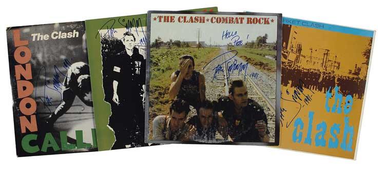 Four albums, each signed on the front cover in blue felt tip by Simonon. Albums are: London Calling, Combat Rock (ins), Black Market Clash, and The Clash. The albums are included. In fine condition, with some scattered light wear to covers. Pre-certified Roger Epperson/REAL and RRAuction COA.