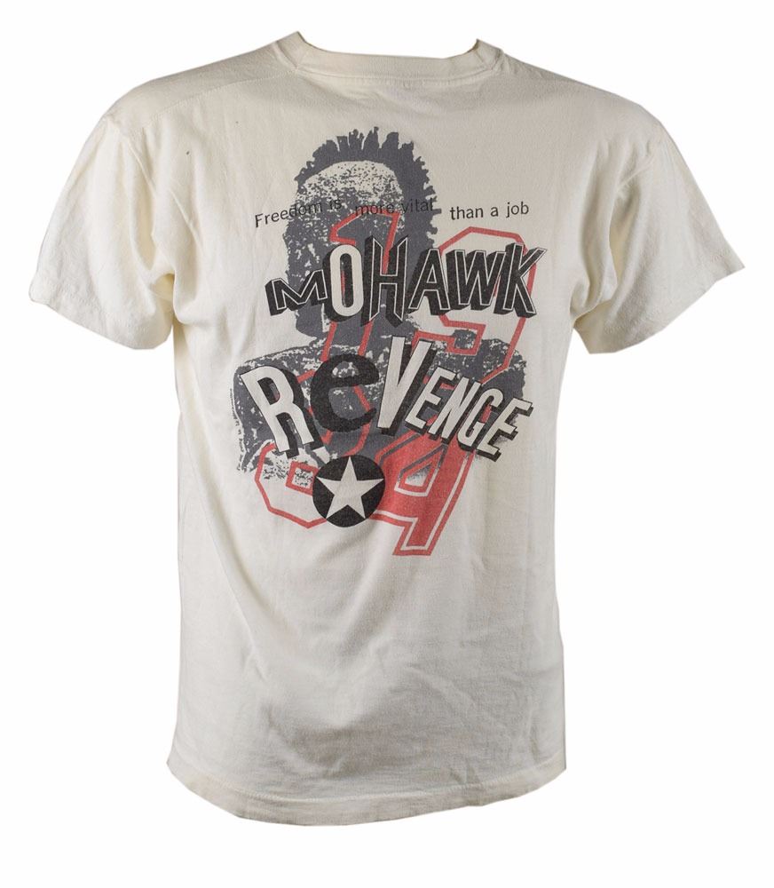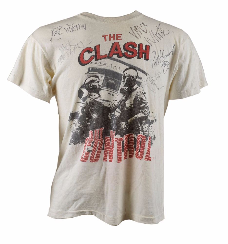 An original 1984 Clash "Out of Control" promotional t-shirt, size XL, signed on the front in black felt tip by the full band: Joe Strummer, Paul Simonon, Nick Sheppard, Pete Howard, and Vince White. In fine condition. Accompanied by a certificate of authenticity from Tracks.