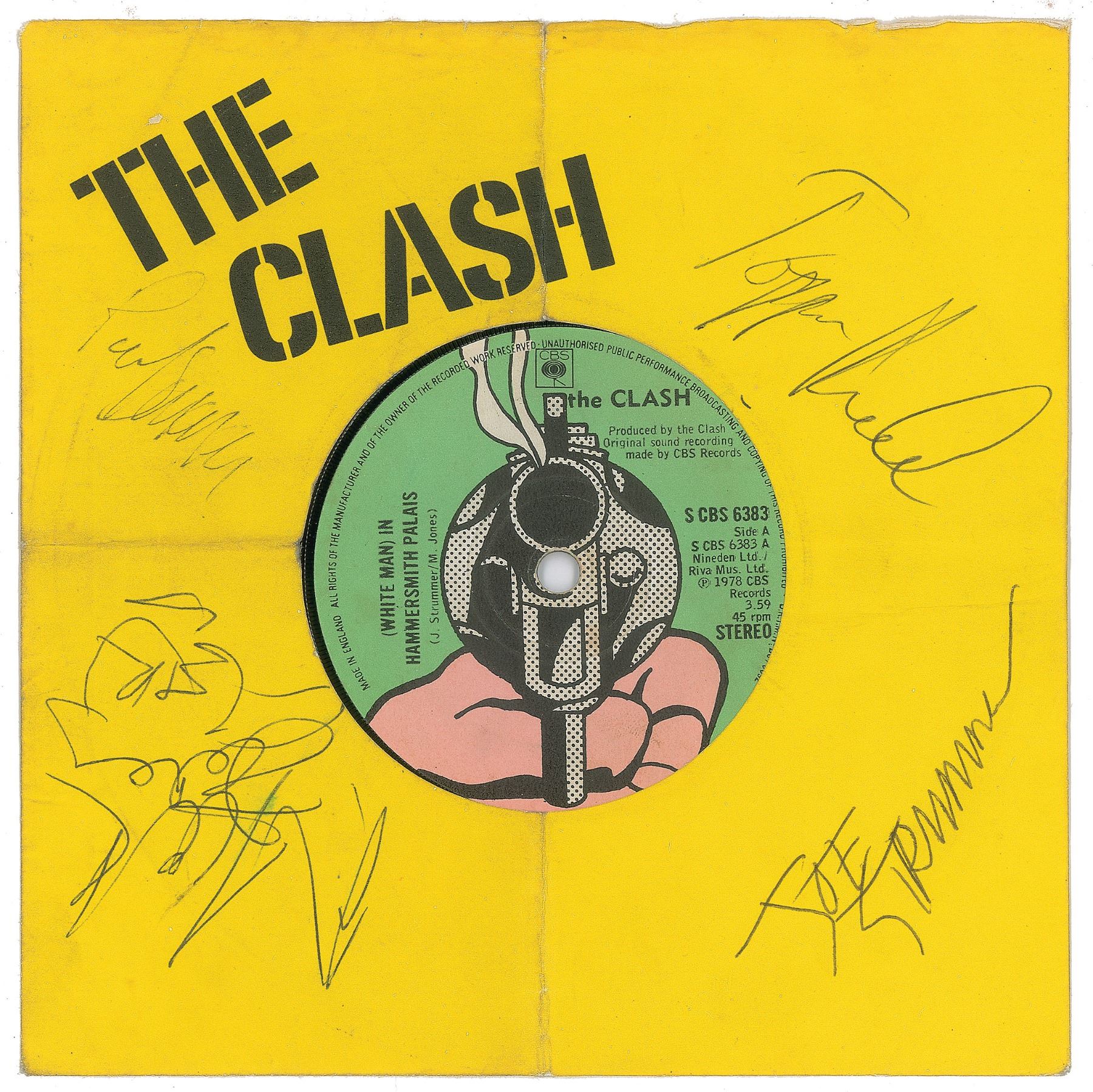 CBS records 45 RPM single of '(White Man) in Hammersmith Palais / The Prisoner,' signed on the paper sleeve in ballpoint by Joe Strummer, Mick Jones, Paul Simonon, and Topper Headon. In very good condition, with overall soiling and intersecting folds. The record is included. Accompanied by a certificate of authenticity from Tracks.