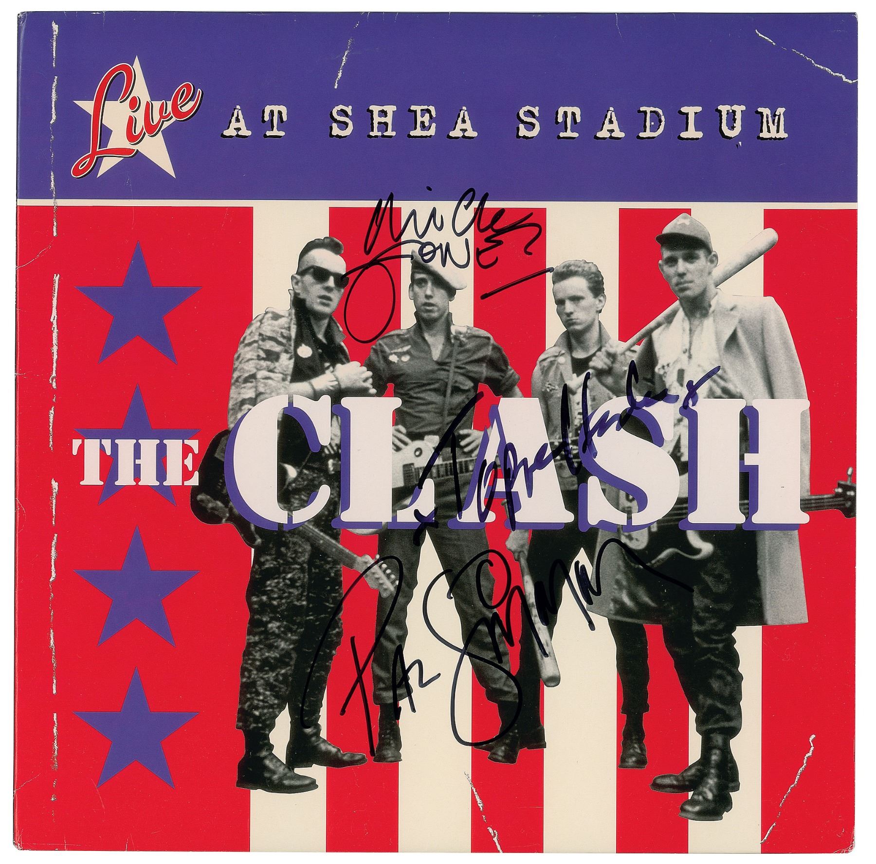 Live at Shea Stadium by The Clash, signed on the front cover in black felt tip by Mick Jones, Topper Headon, and Paul Simonon. In fine condition. The record is included.
