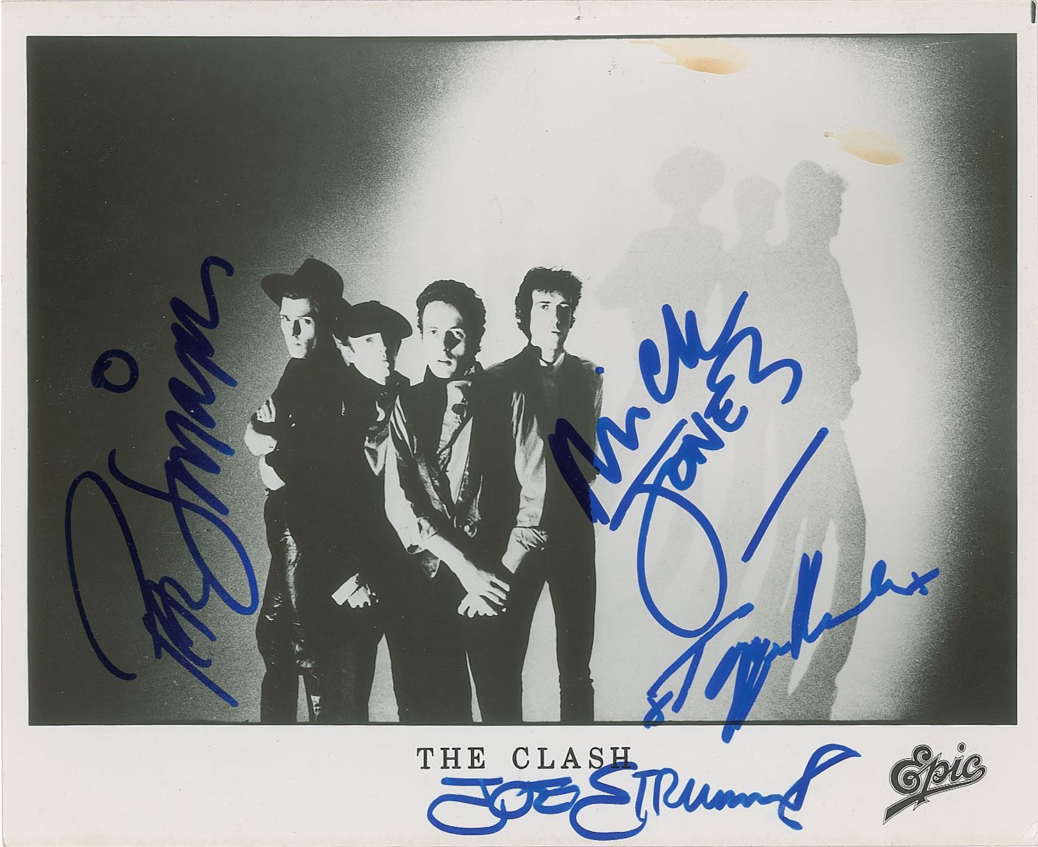 Glossy 10 x 8 Epic Records publicity photo of The Clash posing closely together, signed in blue felt tip by the classic lineup: Joe Strummer, Mick Jones, Paul Simonon, and Topper Headon. In fine condition, with a few surface creases, a small tear to lower right corner tip, and two light stains to the upper background area.