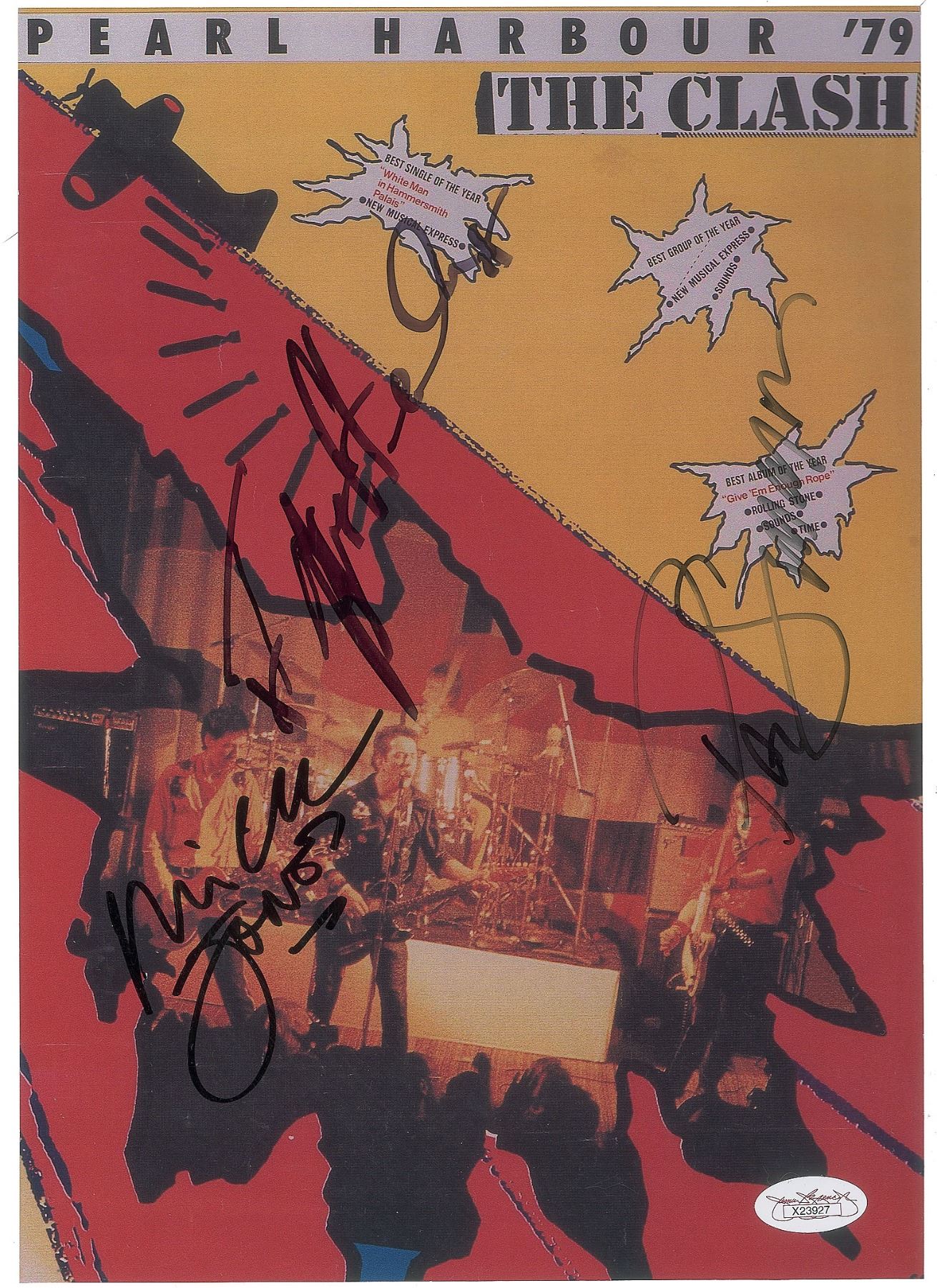 Color glossy 8 x 11.25 photo of a promotional poster for The Clash's 1979 Pearl Harbor Tour, signed in black felt tip by Topper Headon, Paul Simonon, and Mick Jones. In fine condition, with a JSA label affixed to lower right corner. Accompanied by a full letter of authenticity from JSA