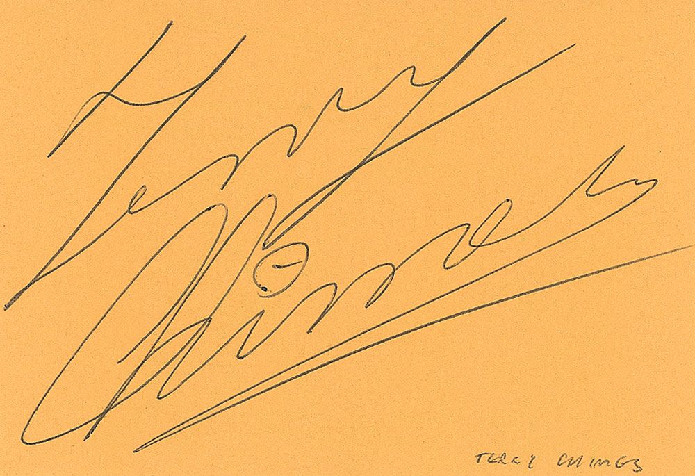 Ballpoint signature, “Terry Chimes,” on a beige 4 x 2.75 slip. In fine condition. Accompanied by a full letter of authenticity from Roger Epperson/REAL.