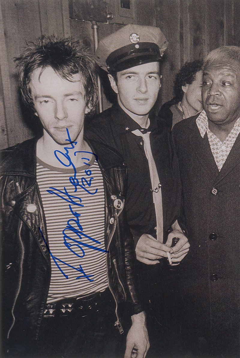 Glossy 8 x 12 photo of Headon and Joe Strummer, signed vertically in blue felt tip, “Topper Headon (2011).” In fine condition. Accompanied by a letter of authenticity from James Spence.