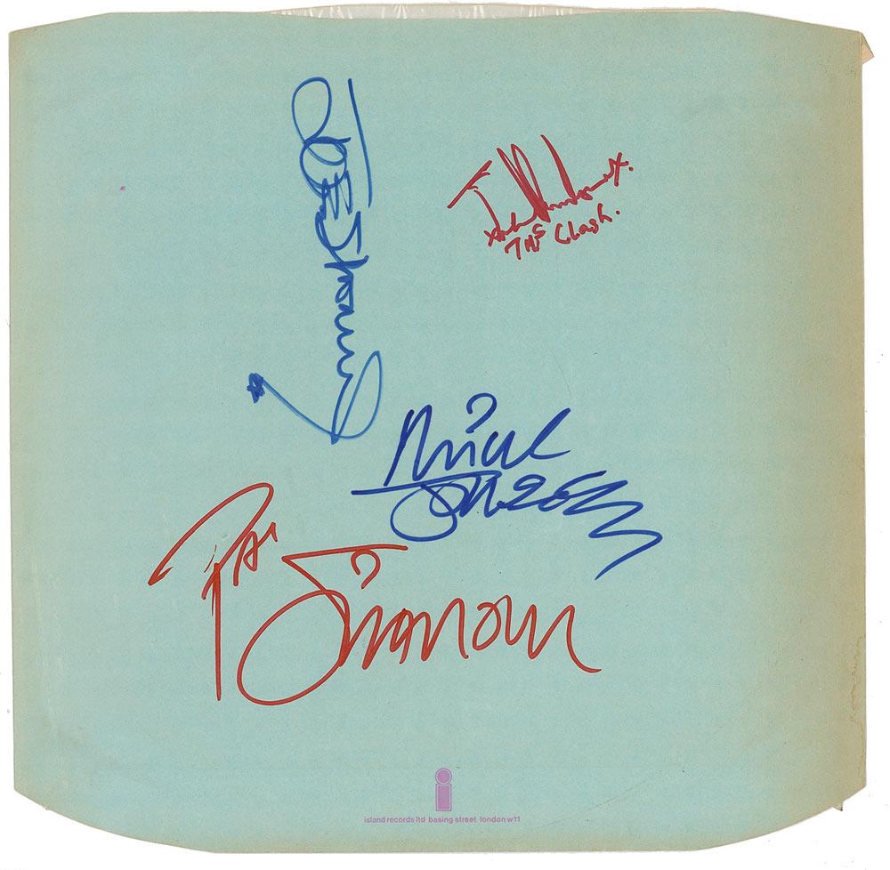 Four blue or red felt tip signatures on an album sleeve, signed by Joe Strummer, Paul Simonon, Mick Jones, and Topper Headon (adding “The Clash.”). In very good condition, with moderate creasing, wrinkling, and mild edge toning.