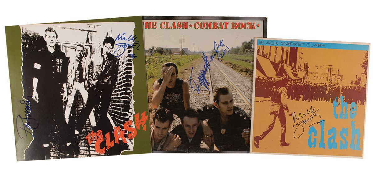Three albums: Combat Rock album signed on the front cover in blue felt tip, “Topper Headon (2011)”; Black Market Clash signed on the front cover in black felt tip by Mick Jones; and The Clash, signed on the front cover in blue felt tip by Mick Jones and Paul Simonon. Scattered edge and corner creasing, a bit of edge wear, and some light rubbing to Combat Rock, otherwise fine condition. Two of the records are included. Accompanied by a letter of authenticity from James Spence for the Jones/Simonon album.