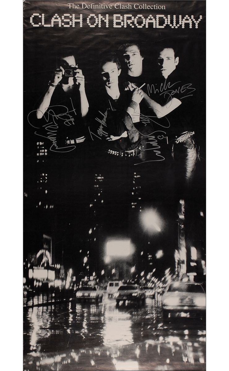 Huge poster, 29 x 58, for The Clash on Broadway, featuring the band hovering over a city scene, signed vertically in silver ink by Joe Strummer, Paul Simonon, Mick Jones, and Topper Headon. Scattered edge creasing and dings and some other light creases, otherwise fine condition.