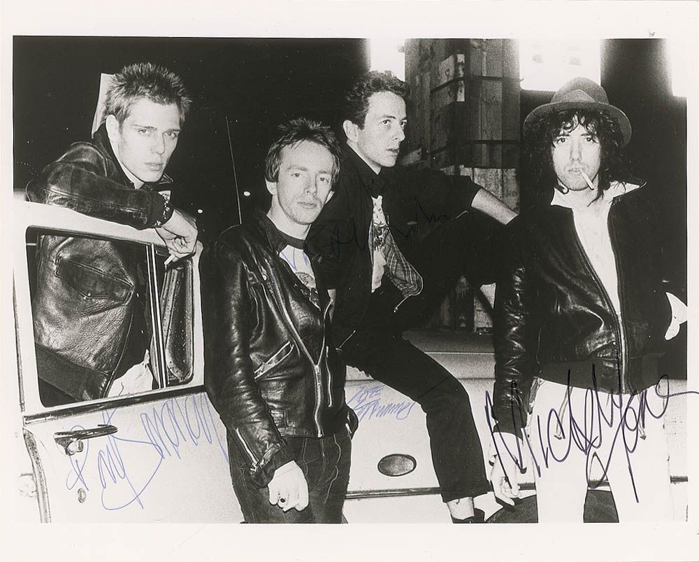 Glossy 10 x 8 group photo, signed in blue ballpoint by Joe Strummer, Paul Simonon, and Nicky Headon and in black felt tip by Mick Jones. In fine condition, with moderate contrast to Headon’s signature.