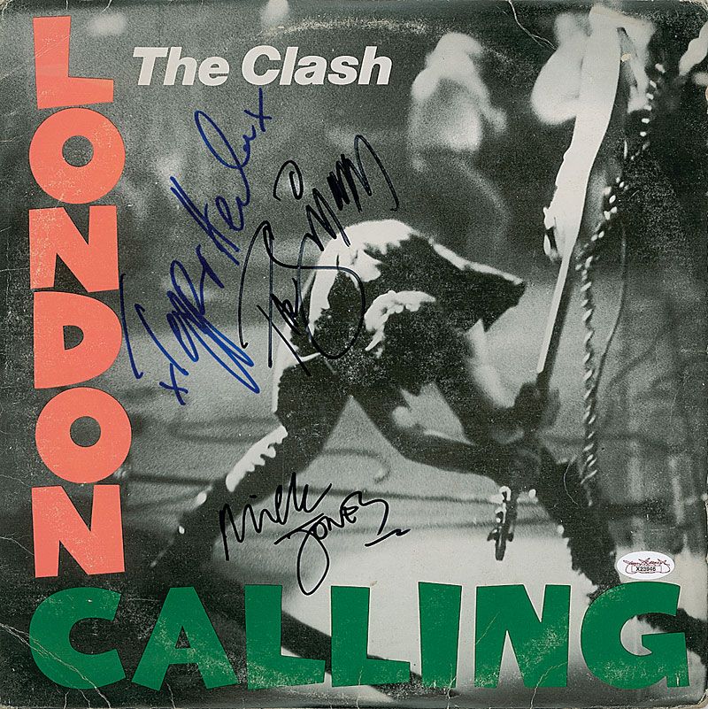 London Calling album signed on the front cover in blue and black felt tip by Mick Jones, Paul Simonon, and Topper Headon. Scattered creases, a light ‘ring of wear,’ and a JSA label affixed to the lower right corner, otherwise fine condition. Accompanied by a full letter of authenticity from JSA. A desirable example of their iconic album.
