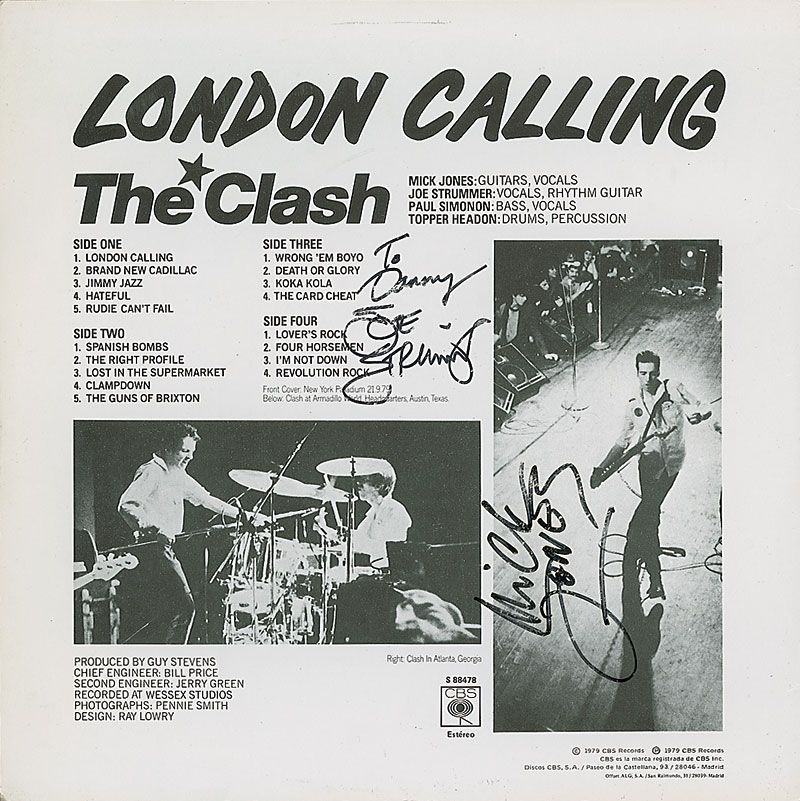 London Calling album signed on the front cover in black felt tip, “Paul Simonon,” and signed and inscribed on the back cover, “To Danny, Joe Strummer,” and “Mick Jones.” In fine condition, with slight irregular adhesion to signatures. The record is included. Accompanied by a certificate of authenticity from Roger Epperson/REAL. Signatures were obtained by an acquaintance of the band who notes: “I befriended the members of BAD II, they used to invite me to their gigs. I was living in London in the 90's. I met Joe when he played in Barcelona. I was the only one in the whole venue who appeared with all the Clash LPs. He invited me to the show, and after his gig we went together to see La Fundación Tony Manero (a local funk band) at the Bikini venue. I met Paul at the KGB venue in Barcelona. I interviewed him for Popular 1 (one of the most important Spanish music mags) when he came with Havana 3AM. He invited me to the backstage after the show.”