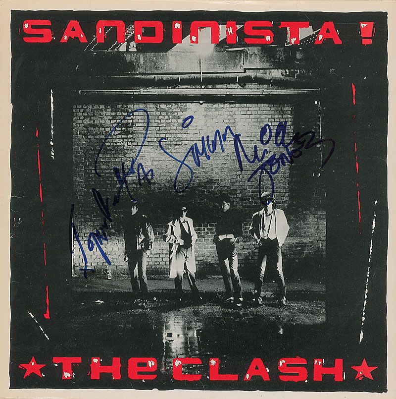 Sandinista album cover signed on the front in blue felt tip by Mick Jones, Paul Simonon, and Topper Headon. In fine condition, with a few creases to edges and the back cover removed and not present. The record is not included. Accompanied by a full letter of authenticity from JSA.