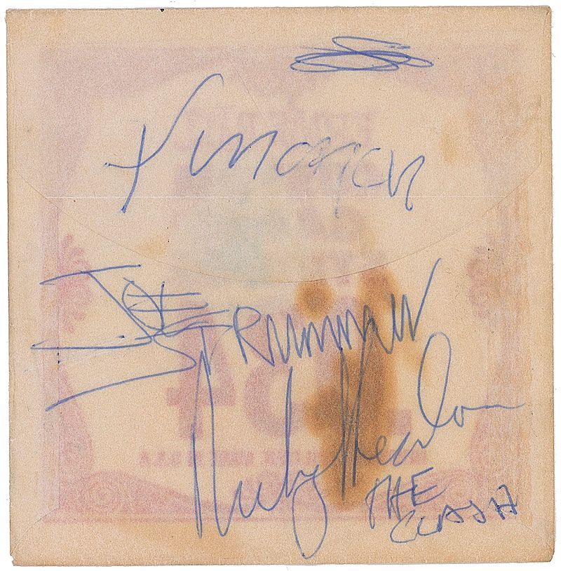 Packaging for an Ernie Ball custom gauge .034 guitar string, signed circa 1977 on the reverse in blue ballpoint, “Joe Strummer,” “Simonon,” and “Nicky Headon.” In very good condition, with a central area of staining.