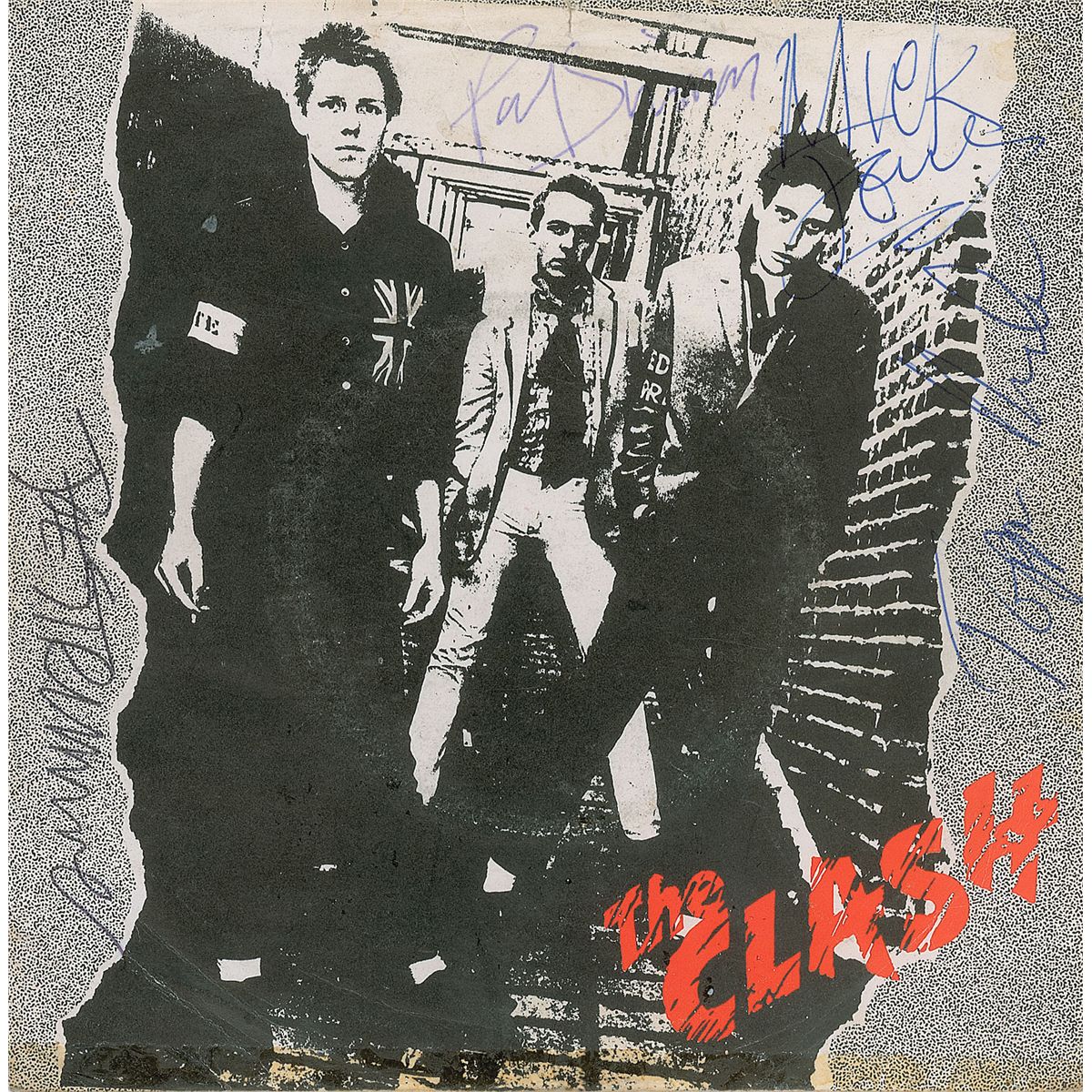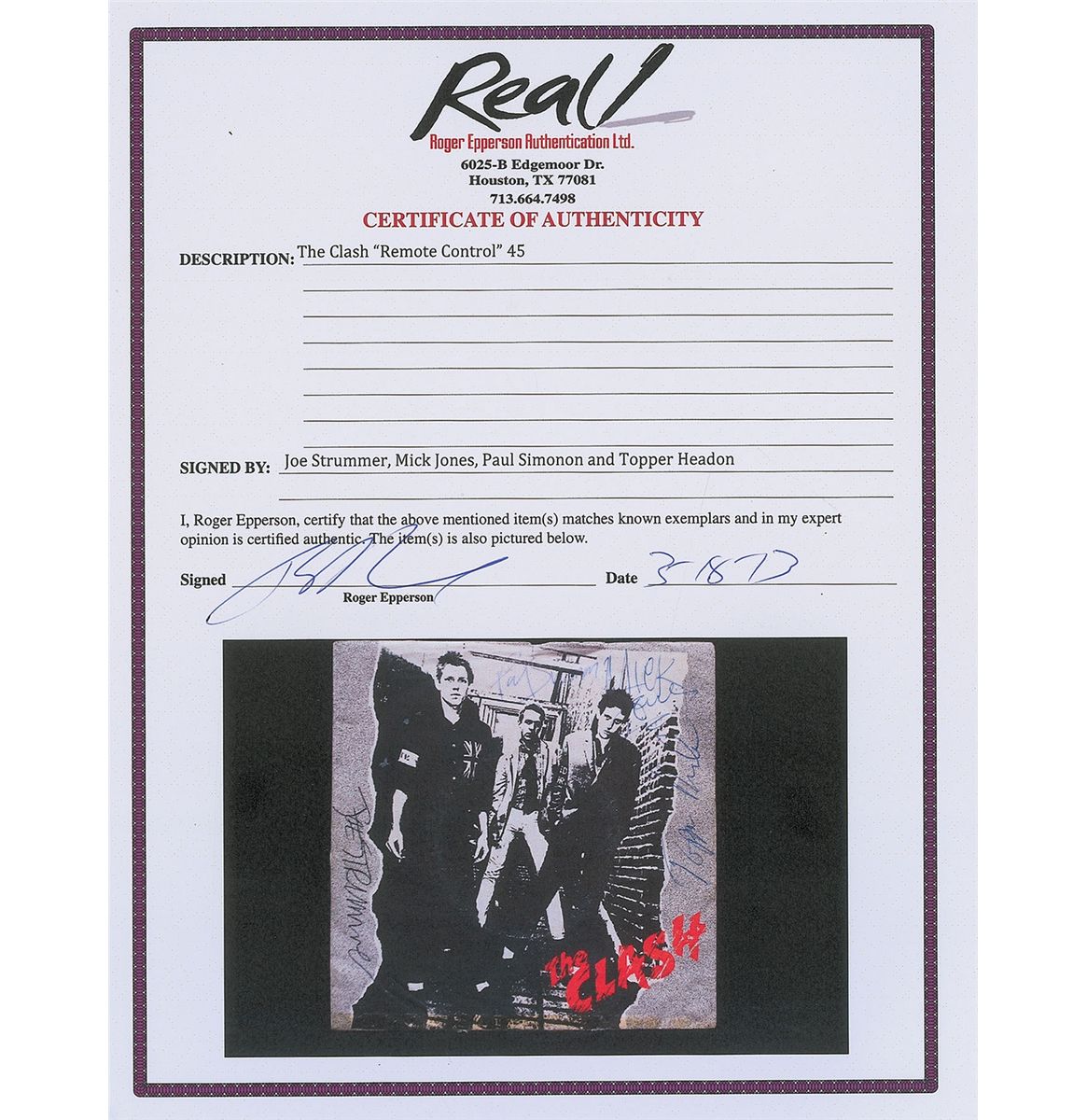 ‘Remote Control/London’s Burning’ 45 rpm record sleeve, signed on the portrait side in ballpoint by Joe Strummer, Mick Jones, Paul Simonon, and Topper Headon. Some scattered light creases and a few edge tears along top edge, otherwise fine condition. Accompanied by a full letter of authenticity from Roger Epperson/REAL.