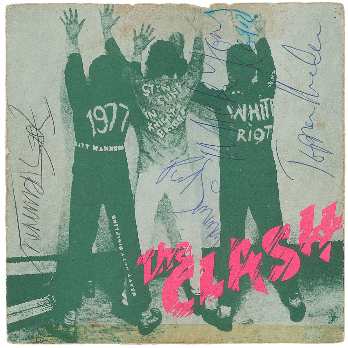 ‘White Riot’ 45 rpm record sleeve, signed vertically in black ballpoint by Joe Strummer, and in blue ballpoint by Mick Jones, Paul Simonon, and Topper Headon. In very good to fine condition, with scattered light soiling, some dampstaining along top edge, lightly affecting a small portion of Jones’s signature, some old tape toning along bottom edge, and a few small tears along top edge. Accompanied by a full letter of authenticity from Roger Epperson/REAL.