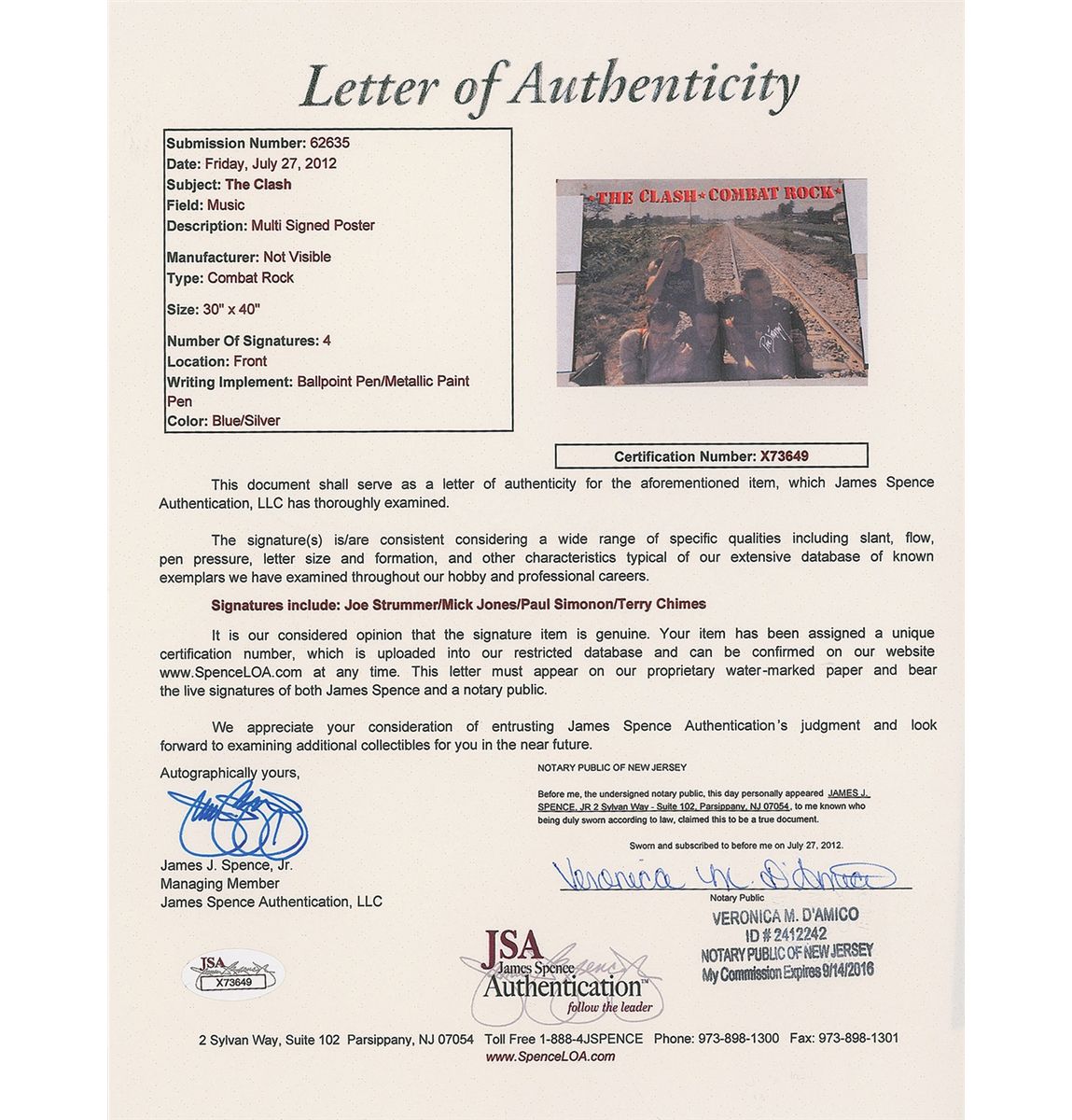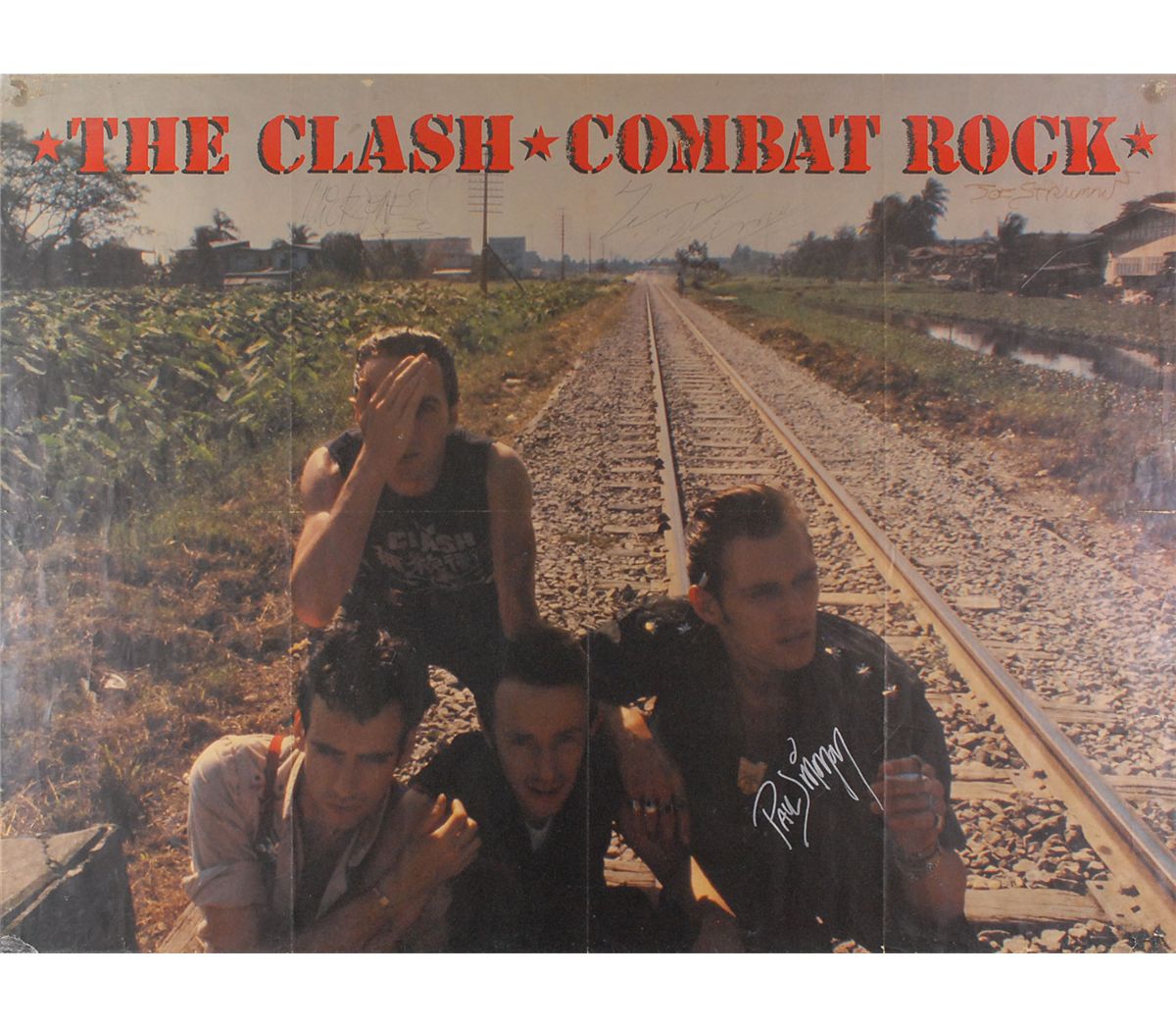 Color 40 x 30 promotional poster for Combat Rock, signed in felt tip by Joe Strummer, in silver ink by Paul Simonon, and in blue ballpoint by Mick Jones and Terry Chimes. Rolled and in very good condition, with previous intersecting storage folds, scattered edge dings and creases, some light fading to Strummer’s signature, and tape and mounting remnants to reverse. Accompanied by a full letter of authenticity from James Spence.