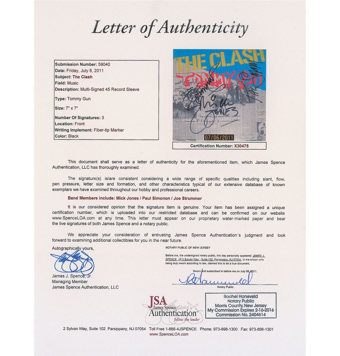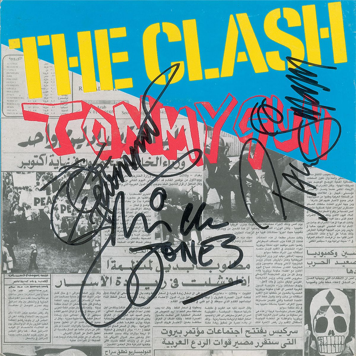 ‘Tommy Gun’ color 45 rpm record sleeve, signed in black felt tip by Joe Strummer, Mick Jones, and Paul Simonon. In fine condition. Accompanied by a full letter of authenticity from James Spence.