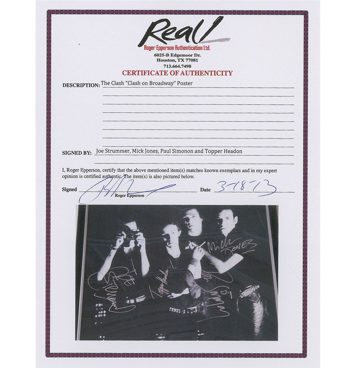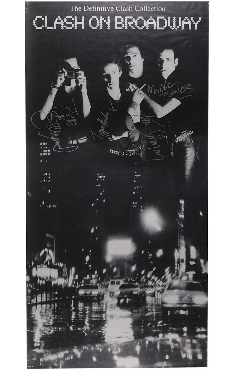 Huge poster, 29 x 58, for The Clash on Broadway, featuring the band hovering over a city scene, signed vertically in silver ink by Joe Strummer, Paul Simonon, Mick Jones, and Topper Headon. Scattered edge creasing and dings and some other light creases, otherwise fine condition. Accompanied by a full letter of authenticity from Roger Epperson/REAL.