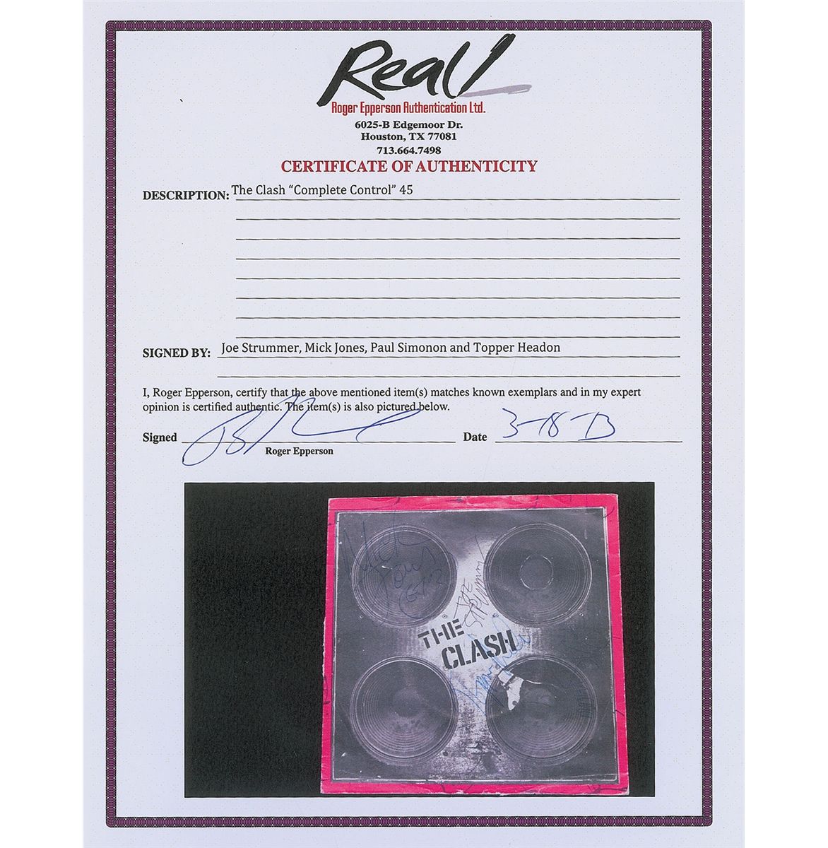 45 rpm record sleeve for ‘Complete Control,’ signed in blue and black ballpoint by Joe Strummer, Mick Jones, Paul Simonon, and Topper Headon. Some edge creases, light contrast to Simonon’s signature, and surface loss to back cover, otherwise fine condition. Accompanied by a full letter of authenticity from Roger Epperson/REAL.