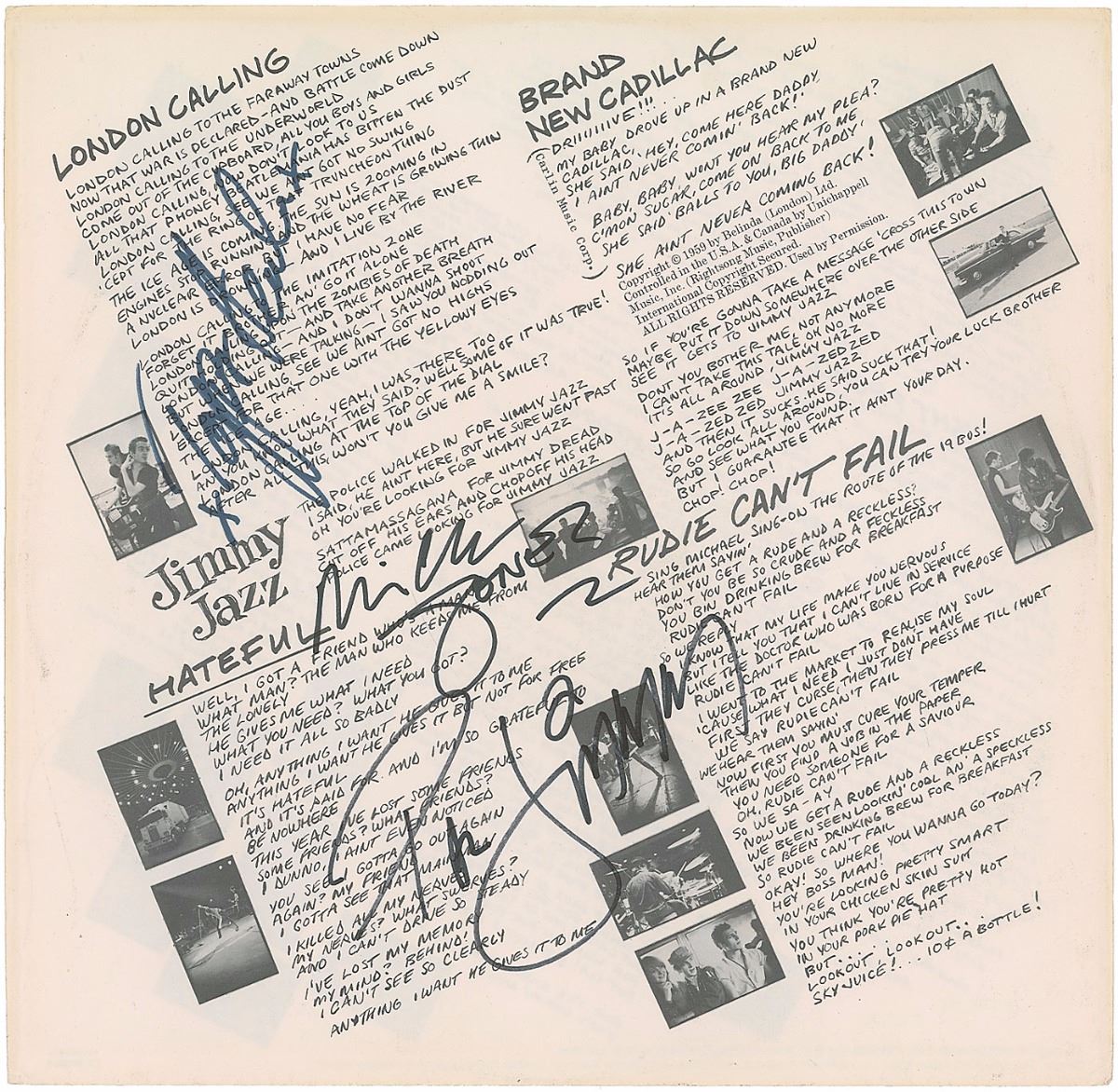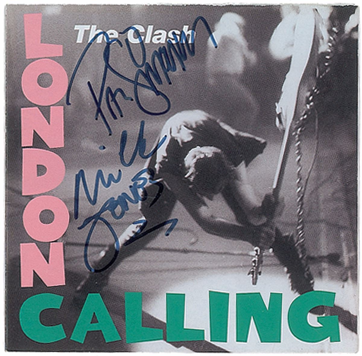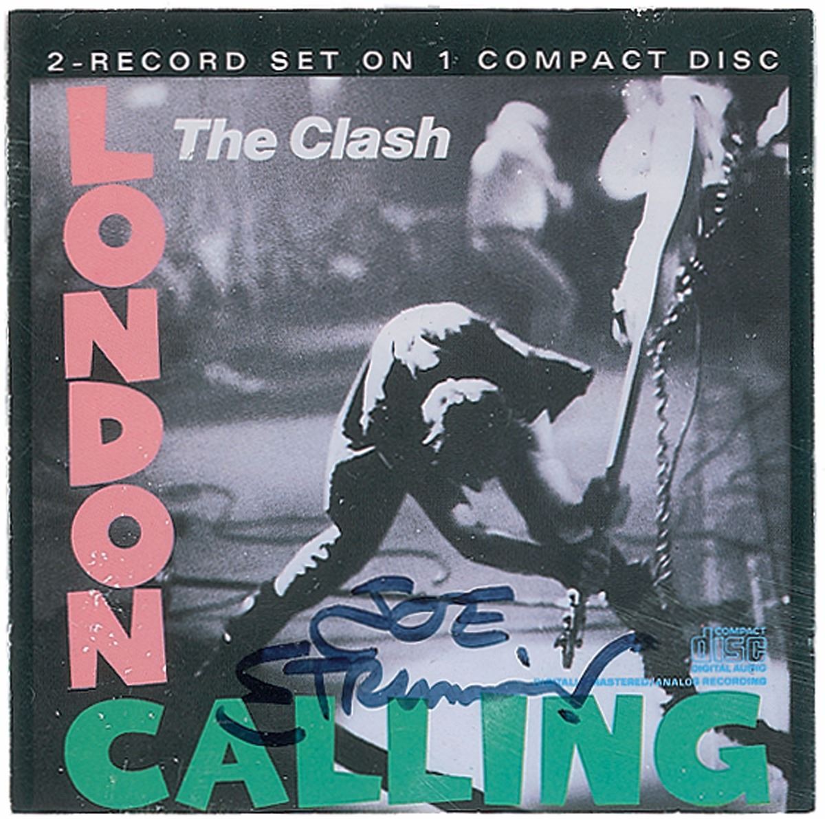 Four items: a pair of London Calling CD sleeves, one signed in black felt tip by Joe Strummer, the other in black felt tip by Mick Jones and Paul Simonon; and the two sleeves for a London Calling double album, both signed in black felt tip by Simonon and Jones, and in blue felt tip by Topper Headon. In overall fine condition, with slight creasing and soiling to album sleeves (side B is affixed with a James Spence label in the lower right corner), and trivial rubbing to the Strummer signed CD sleeve. Each item is accompanied by a full letter of authenticity from JSA, with the exception of the Jones and Simonon signed CD sleeve, which is accompanied by a full letter of authenticity from REAL.