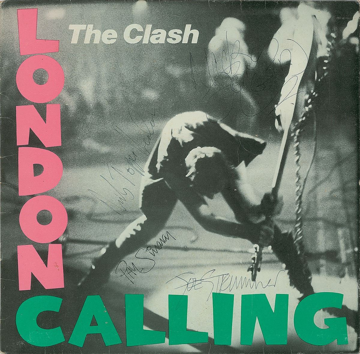 London Calling album signed on the front cover in black ink by Joe Strummer, Mick Jones, Paul Simonon, and Topper Headon. In fine condition. The record is not included. Consignor notes that the signatures were obtained in January 1980. An early pressing of the classic album without the presence of the hit single ‘Train in Vain.’