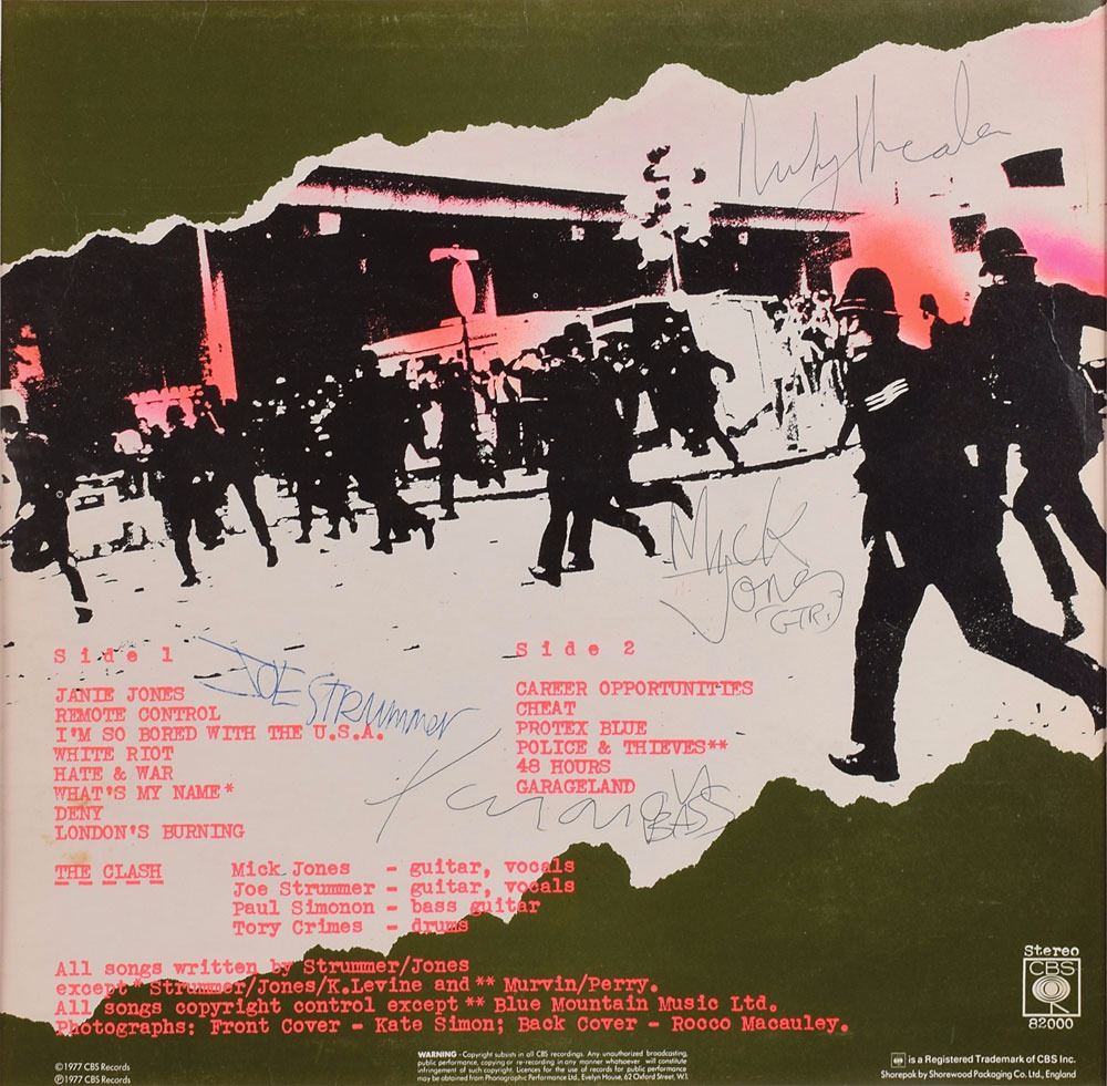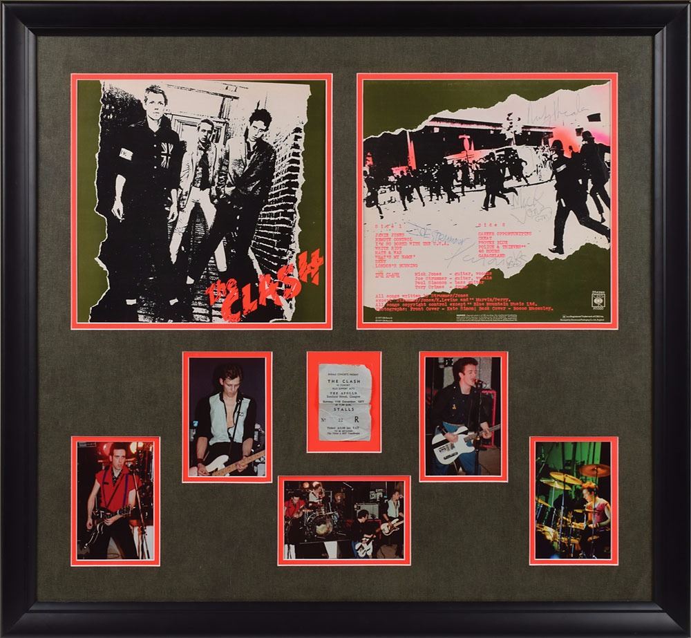 Self-titled debut album signed on the back cover in black ballpoint, "Paul Simonon, Bass," "Mick Jones (GTR.)," and "Nicky Headon," and in blue ballpoint, "Joe Strummer." Attractively double-cloth-matted with the album's front cover, five images of the band playing live, and a used concert ticket from The Clash's concert at Glasgow's The Apollo on December 11, 1977, to an overall size of 34 x 31. In fine condition.