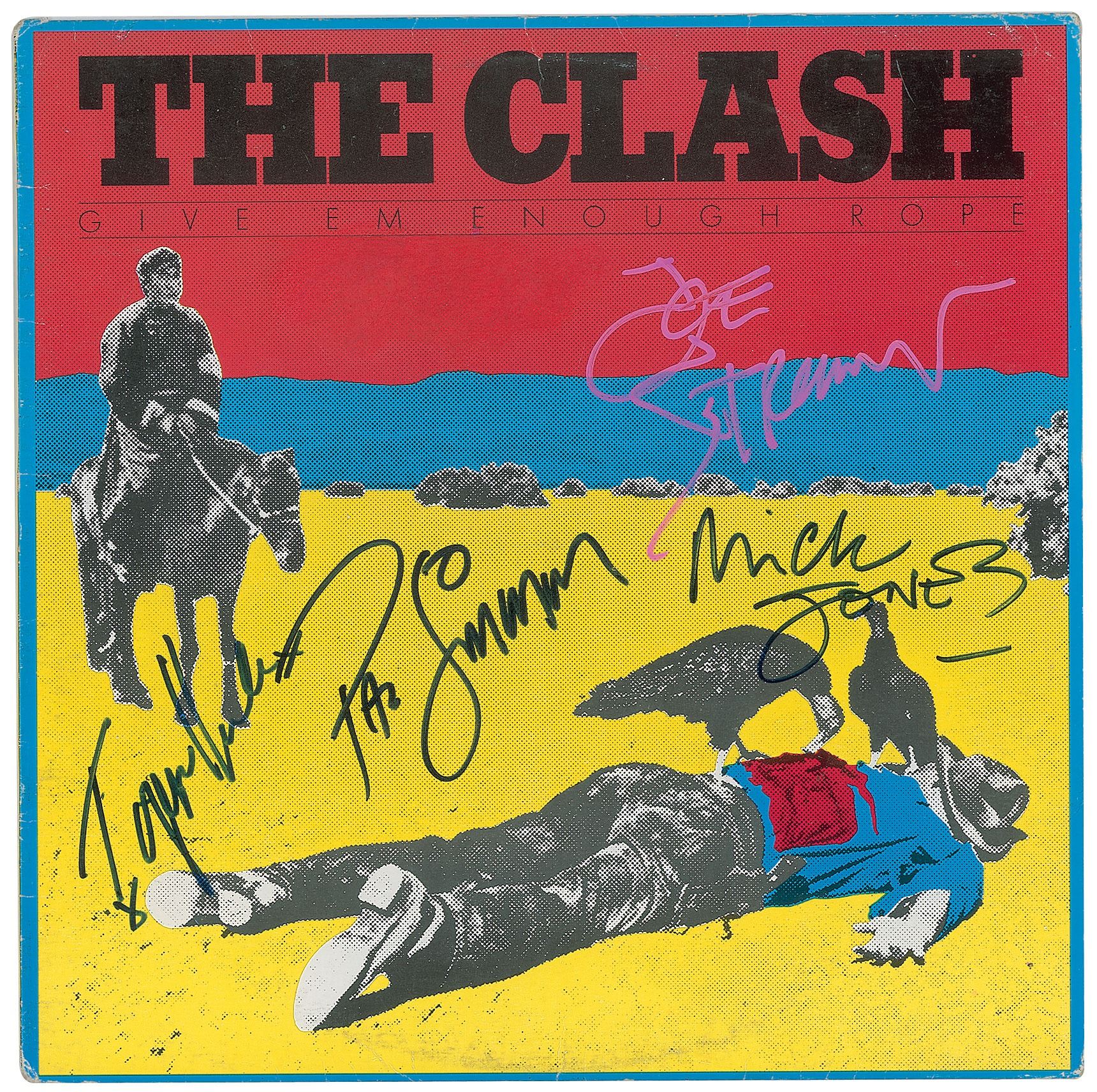 Give 'Em Enough Rope album by The Clash, signed on the front cover in pink paint pen by Joe Strummer, and in black felt tip by Mick Jones, Paul Simonon, and Topper Headon. In very good to fine condition. The record is not included. Consignor notes an inscription to the left of the Strummer signature has been professionally removed.