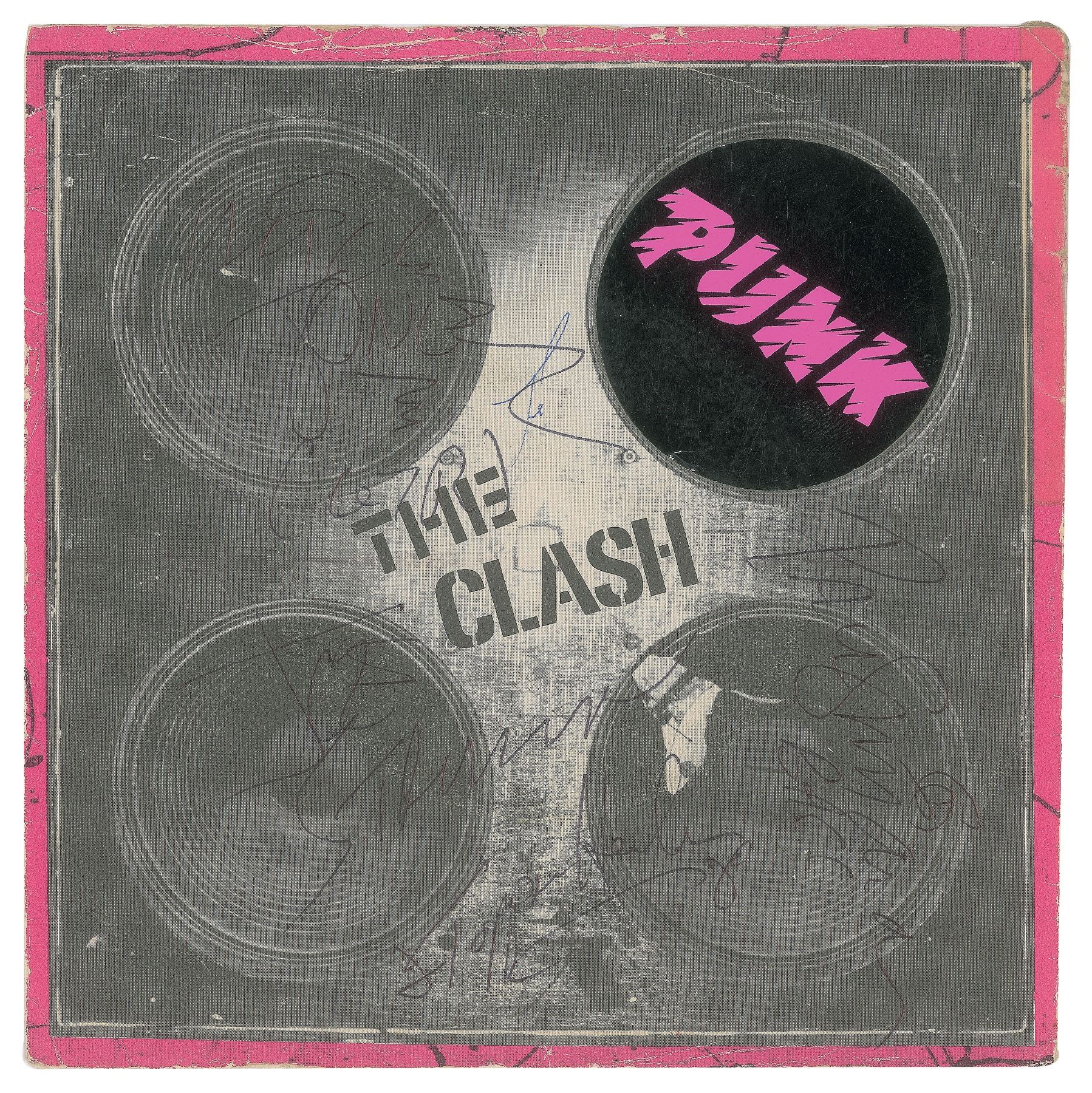 CBS Records 45 RPM single record for 'Complete Control / City of the Dead,' with rare "Punk" sticker applied to the front, signed on the sleeve in black ballpoint by Joe Strummer, Mick Jones, Topper Headon, and Paul Simonon. In very good to fine condition, with light creasing and moderate signature contrast. The record is included. Released as a 7" single and featured on the US release of their debut album, 'Complete Control' is regarded as one of the Clash's great punk singles.