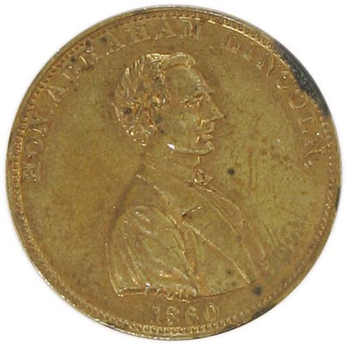 <B>The Classic Rail Splitter Campaign Token.</B></I> A fabulous political token of the nineteenth century that best articulates the mass production of artifacts to sway the votes: the depiction of the manly, salt-of-the-Earth candidate showing his great physical prowess. The rail splitter token, 28mm, is an absolute requisite addition to any collection of substance -- without a specimen, the holding (be it Lincoln, political, numismatic… whatever) is far from complete. Small areas of tarnish or black verdigris at perimeter, a good deal of original luster. Very little rubbing, high detail.<BR><BR><b>Shipping:</b> Miscellaneous Collectibles, Smal (<a target="_blank" href="http://www.heritageauctions.com/common/shipping.php">view shipping information</a>)