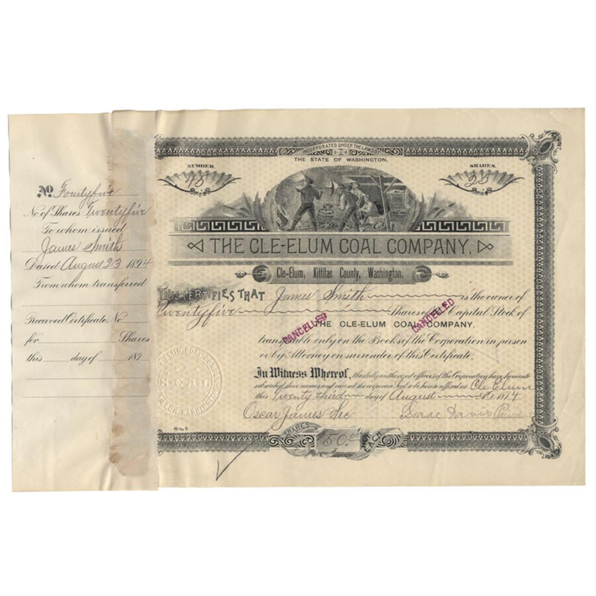 1894. Washington. Stock certificate for 25 shares. Peach/Black. Top center vignette of miners working. Litho. Stamp cancelled and Excellent.