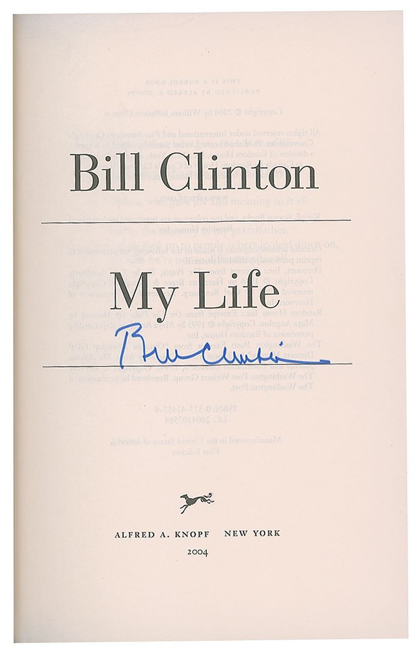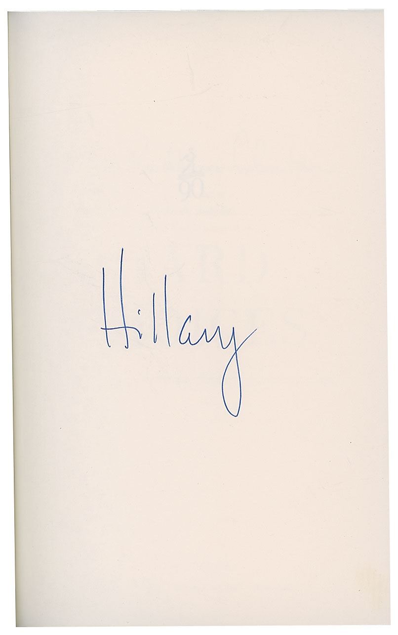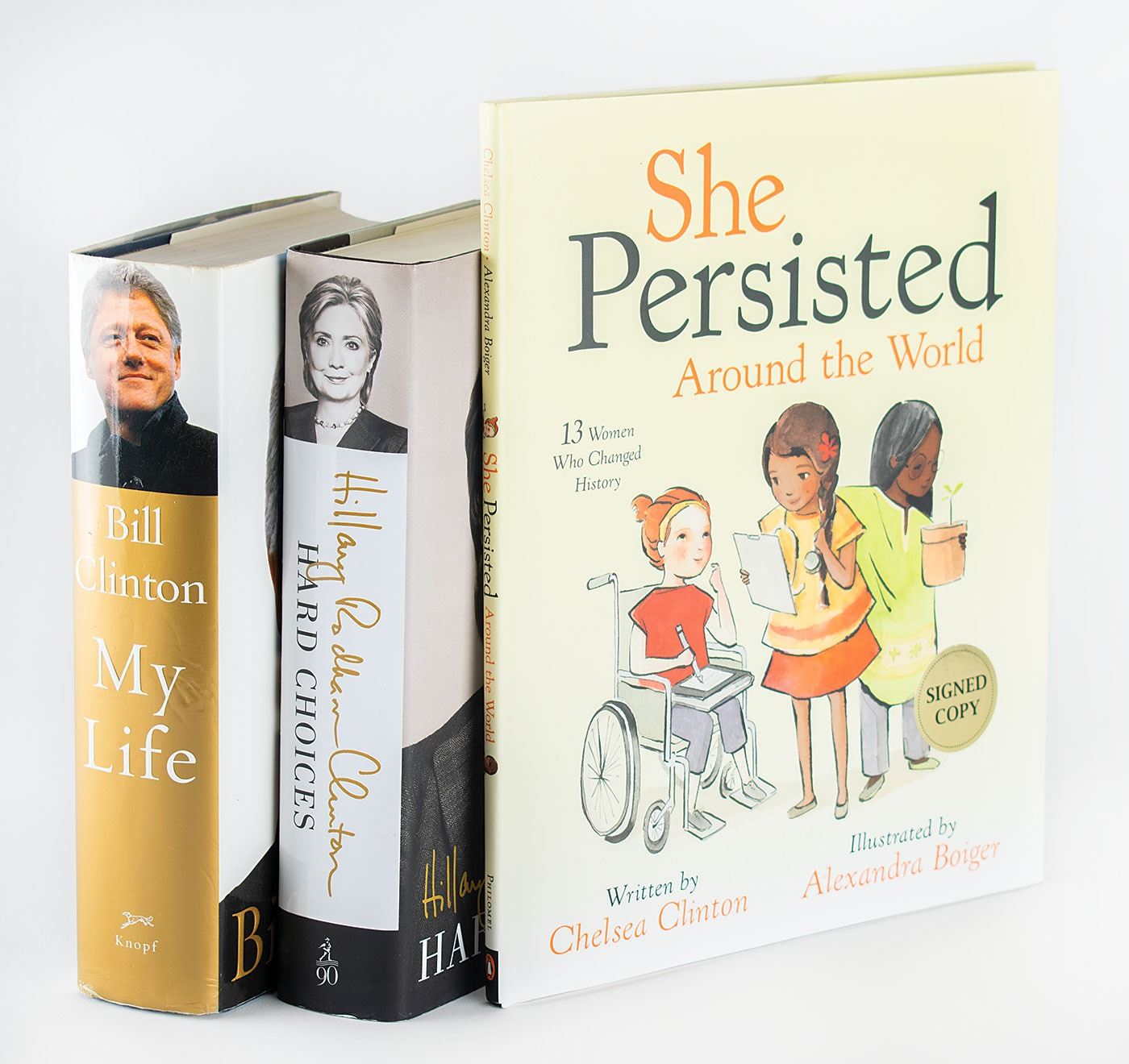 Three books signed by members of the Clinton family: a first edition of My Life by Bill Clinton, hardcover with dust jacket, signed on the title page in blue felt tip, "Bill Clinton"; a first edition of Hard Choices by Hillary Clinton, hardcover with dust jacket, signed on the title page in blue ballpoint, "Hillary"; and a first edition of She Persisted: Around the World by Chelsea Clinton, hardcover with dust jacket, signed on a free end page in black felt tip, "Chelsea Clinton." In overall fine condition.