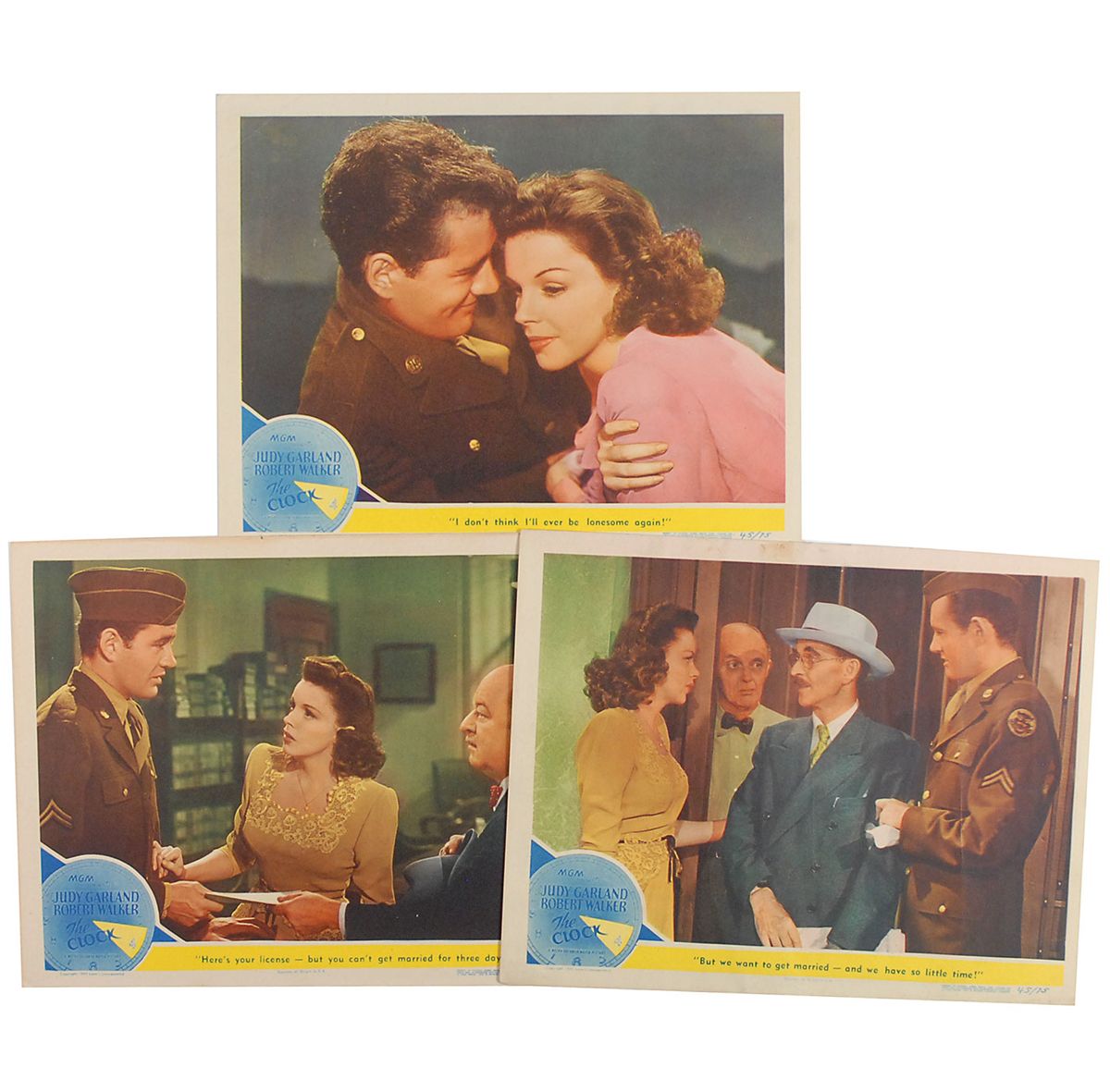 Three original color 14 x 11 lobby cards for the 1945 film The Clock, all showing Garland and co-star Robert Walker together in various scenes. Some light scattered creases and soiling, otherwise overall fine condition.