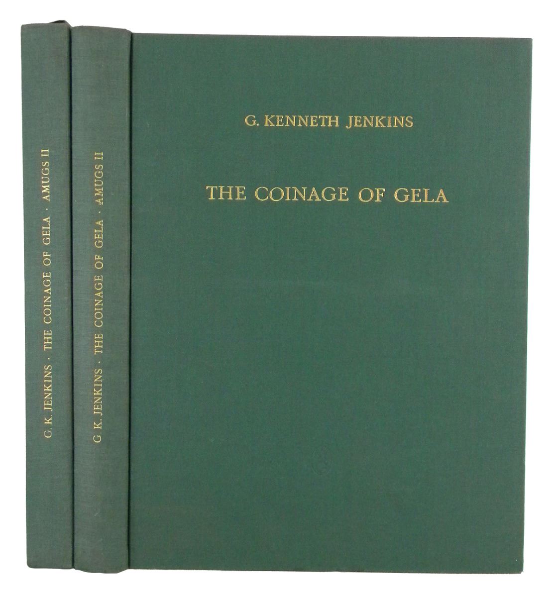 Jenkins, G. Kenneth. THE COINAGE OF GELA. First edition. Berlin: Deutsches Archäologisches Institut, 1970. Two volumes. 4to, original green cloth, gilt, with matching plate folder. xxiv, 312 pages, text figures, maps; 16 pages, 56 fine plates of coins. Minor signs of wear; still near fine. Antike Münzen und geschnittene Steine, Band II. Clain-Stefanelli 2224*. Daehn 3010: "A comprehensive study of the coinage of Gela." Kroh 19 (five stars): "Absolutely essential, the English text is very clear and informative, the plates excellent."