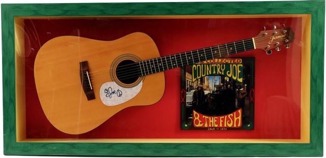 "The Collected Country Joe and the Fish" wood framed and autographed "Jasmine by Takamine" acoustic guitar. Framed in a green wooden case with a plexiglass shadow box display. Includes certification. Measures approximately 24" x 49".