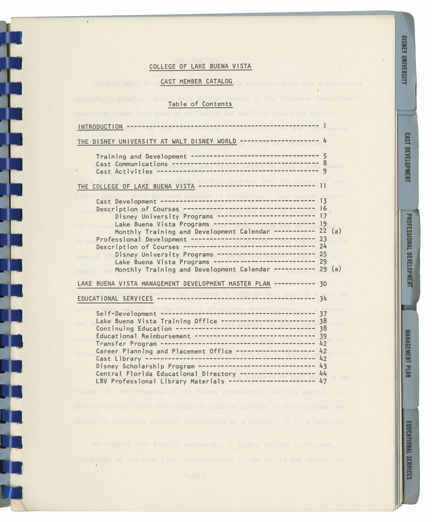 (Walt Disney World, 1976) A spiral-bound cast member training manual from the College of Lake Buena Vista which was part of Disney University at Walt Disney World. This 48-page manual was designed to coordinate, develop, and administer company and divisional training and education for Walt Disney World cast members. Measuring 11"x9.25", the manual is in good condition with some edge-wear wear and yellowing due to age and use. There is some bending to the divider tabs.