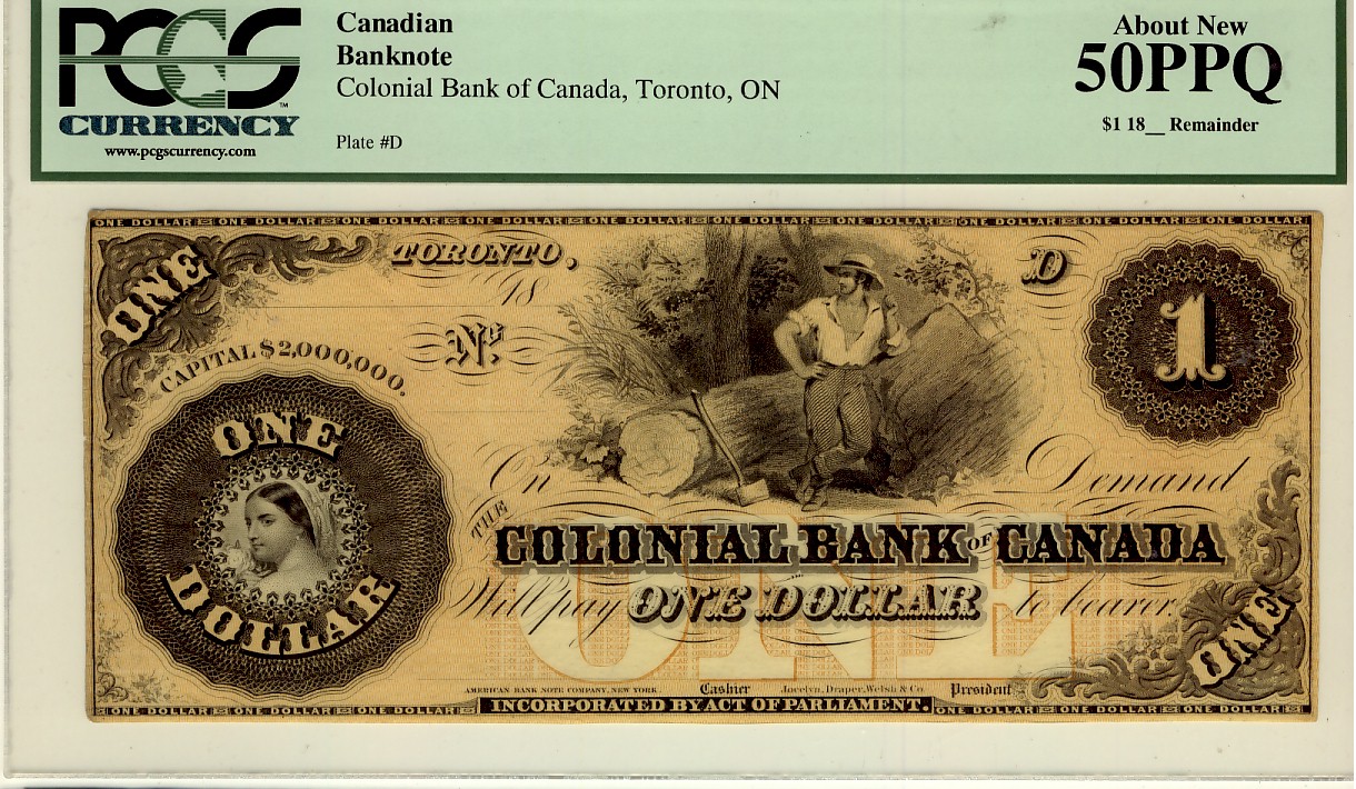 The Colonial Bank of Canada 1859 $1 CH-130-10-02-02R PCGS AU50 PPQ