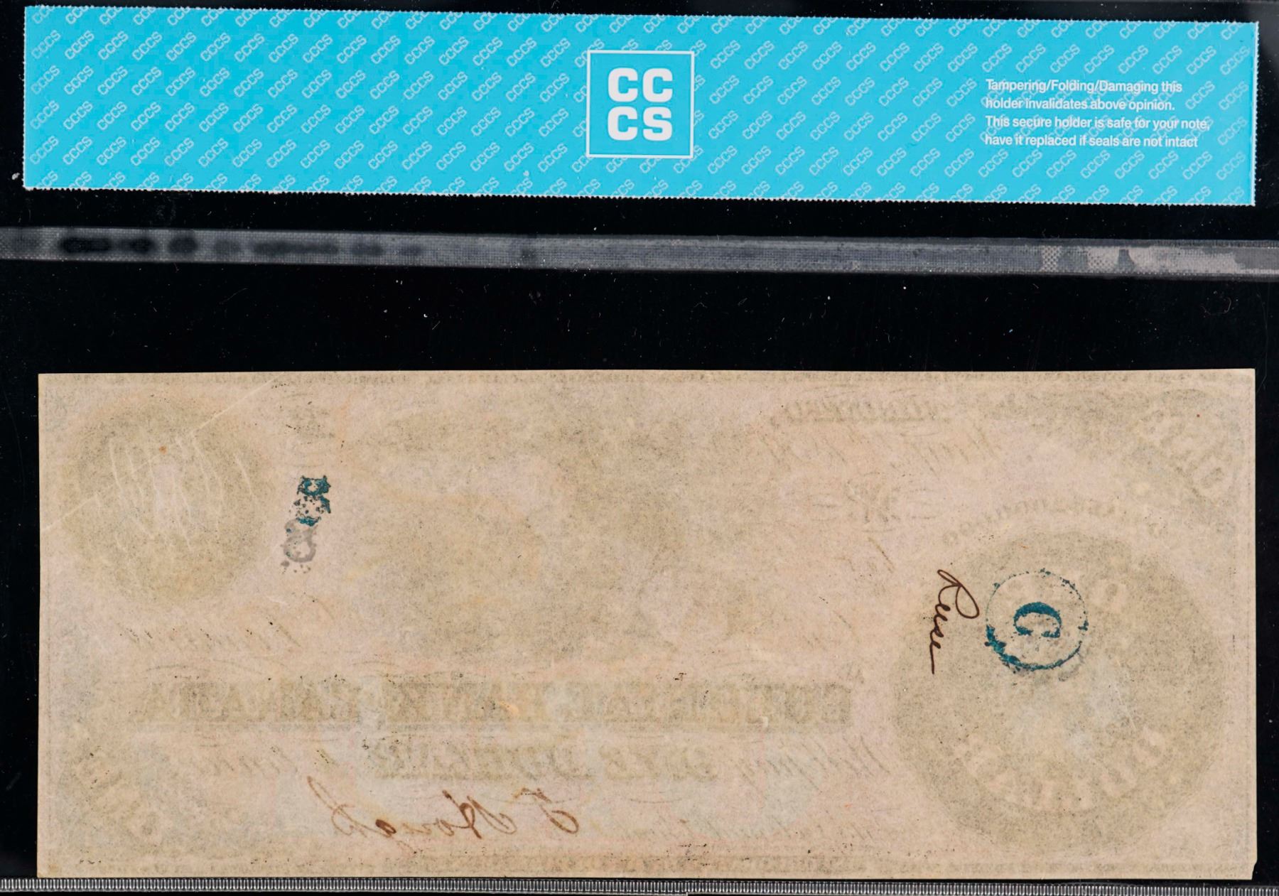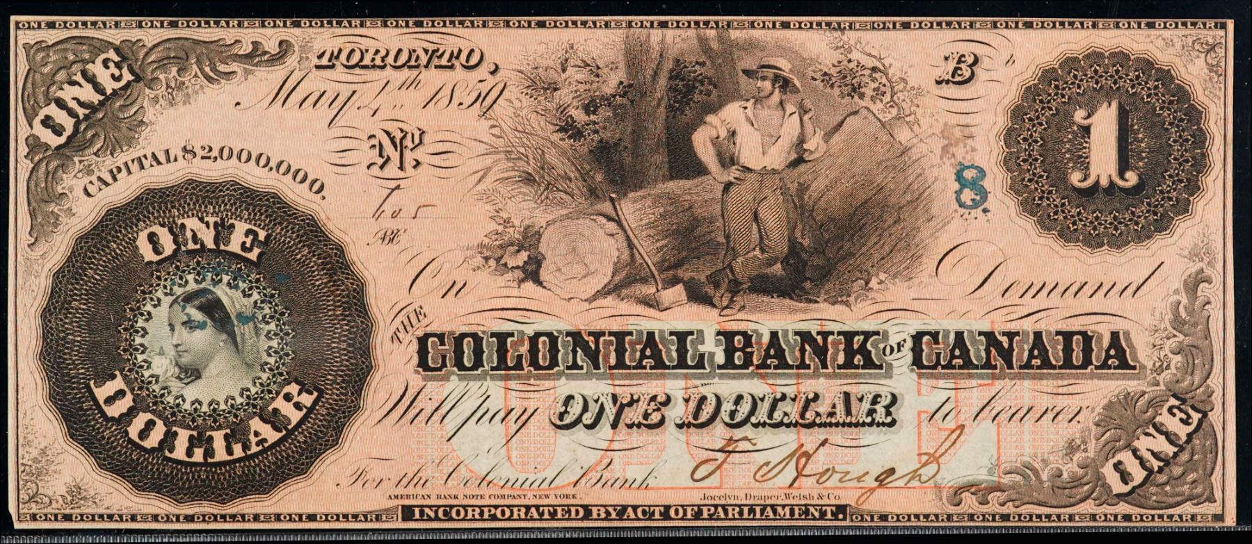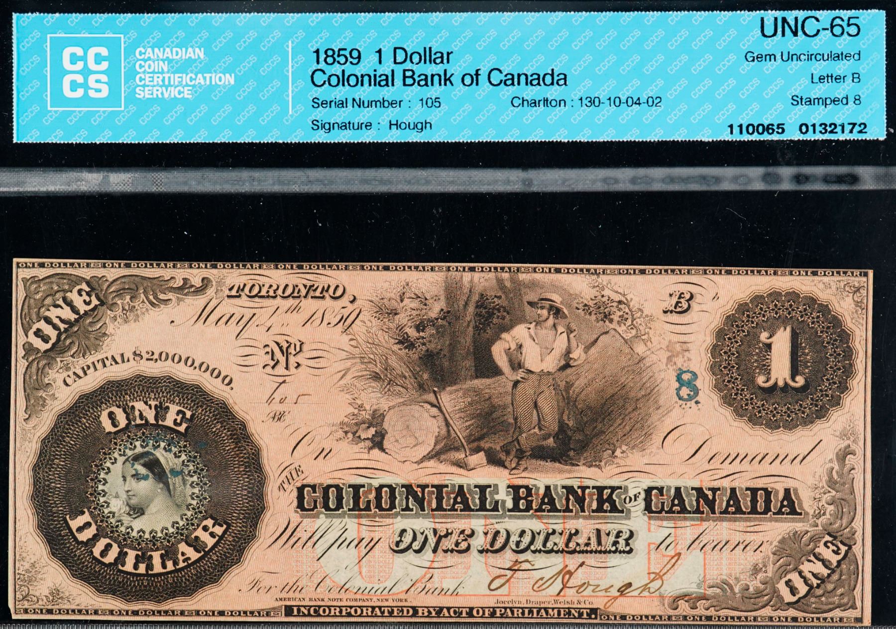 The Colonial Bank of Canada 1859 $1 letter B stamped 8 #105 CH-130-10-04-02 CCCS Gem Uncirculated-65