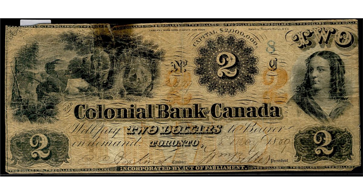 The Colonial Bank of Canada; 1859 $2 #2399 CH-130-10-02-04, VG with tape repair on top border.