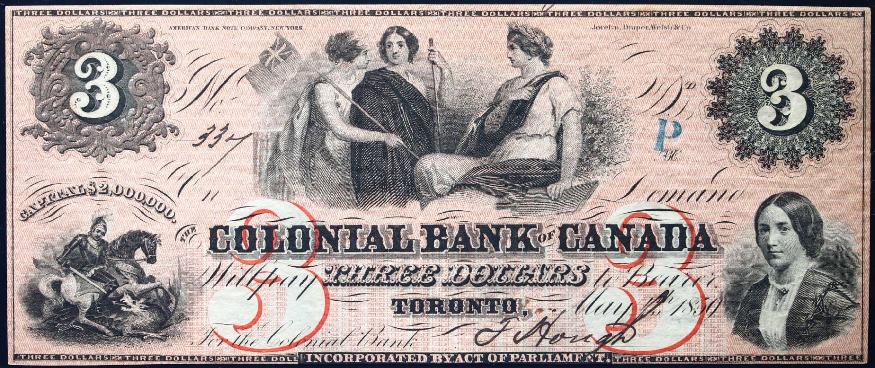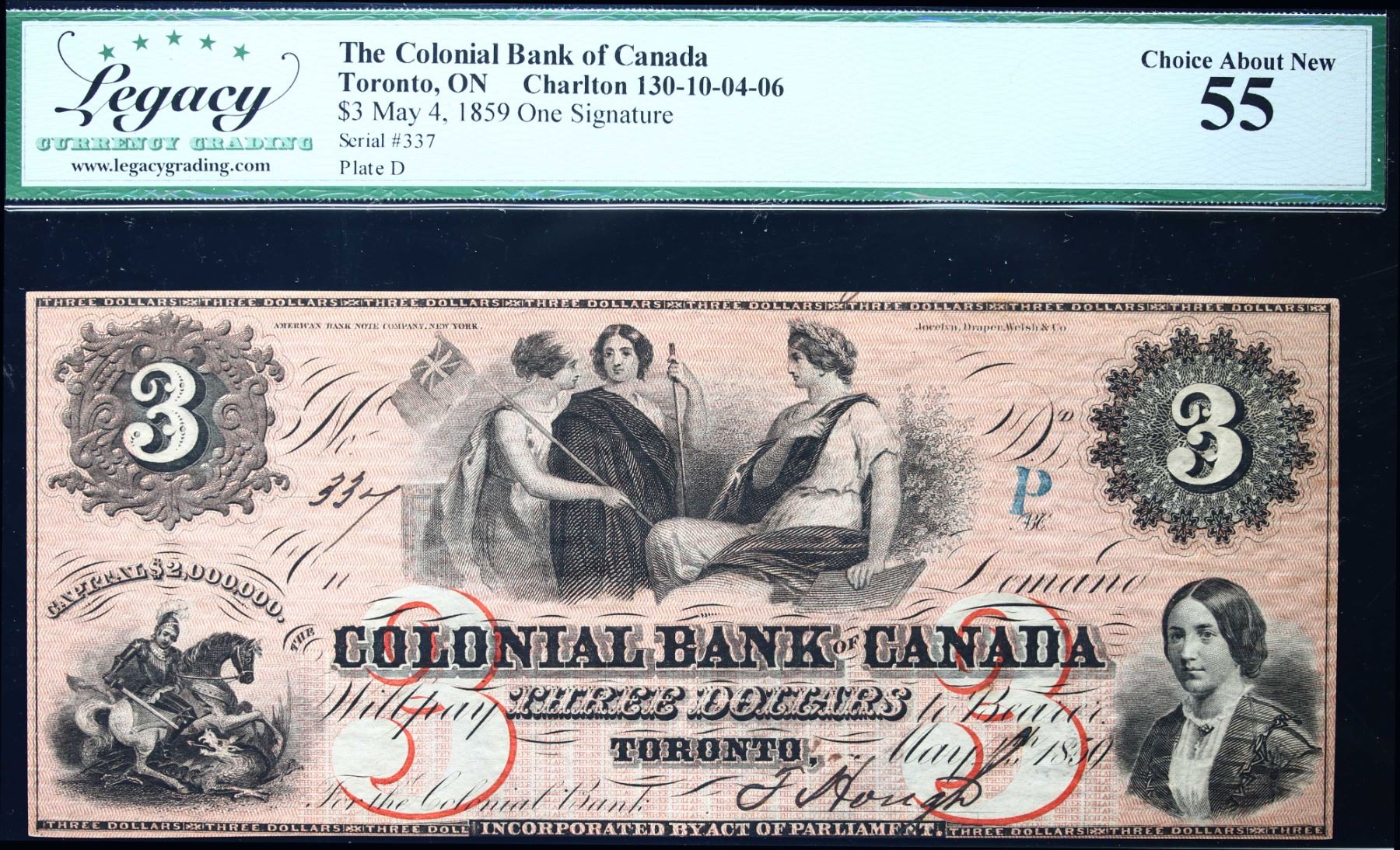 The Colonial Bank of Canada 1859 $3 CH-130-10-04-06 'P IN BLUE O/P' #846 LCG Choice About Uncirculated-55