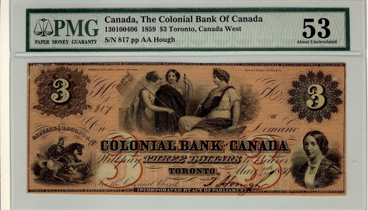 The Colonial Bank of Canada, 1859 $3 CH-130-10-04-06. PMG AU