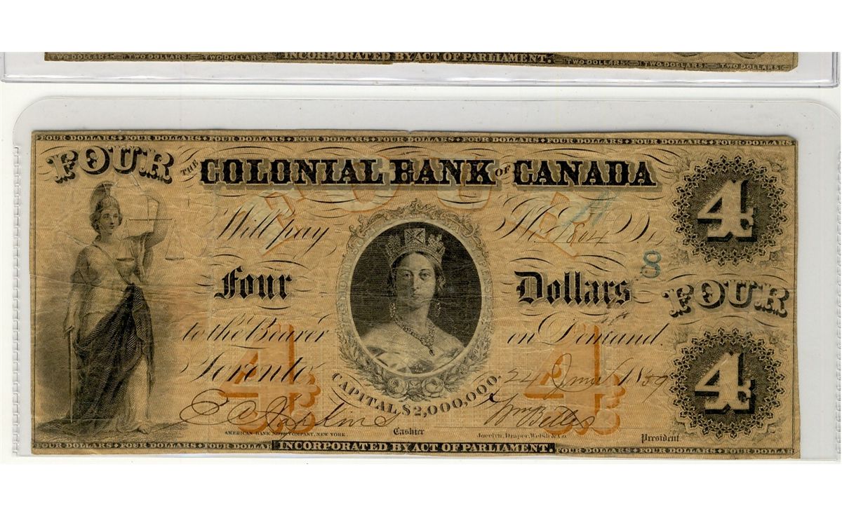 The Colonial Bank of Canada 1859 $4 #1804 CH-130-1010-02-08. A nice Fine issue.