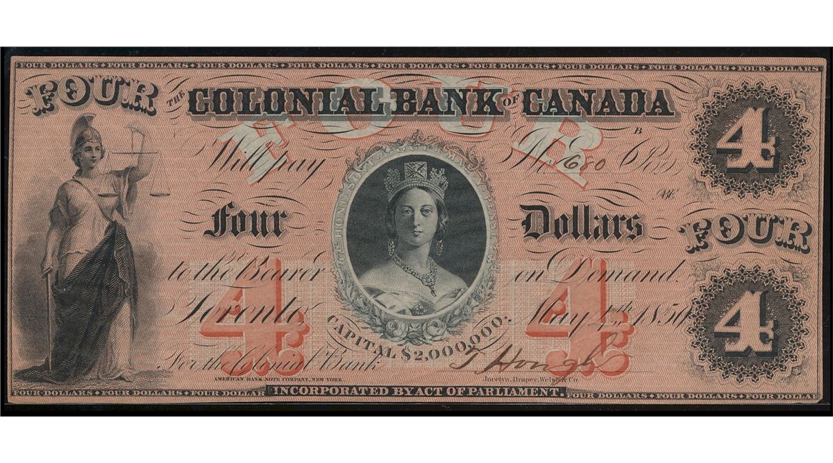 The Colonial Bank of Canada; 1859 $4 #680 CH-130-10-04-08. EF for grade with light corner nick.