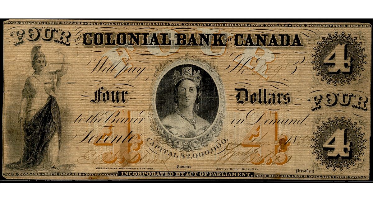 The Colonial Bank of Canada; 1859 $4 CH-130-02-08 Fine. Small corner nick.