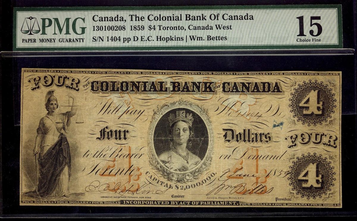 The Colonial Bank of Canada, 1859 $4 CH-130-10-02-08. PMG F15.