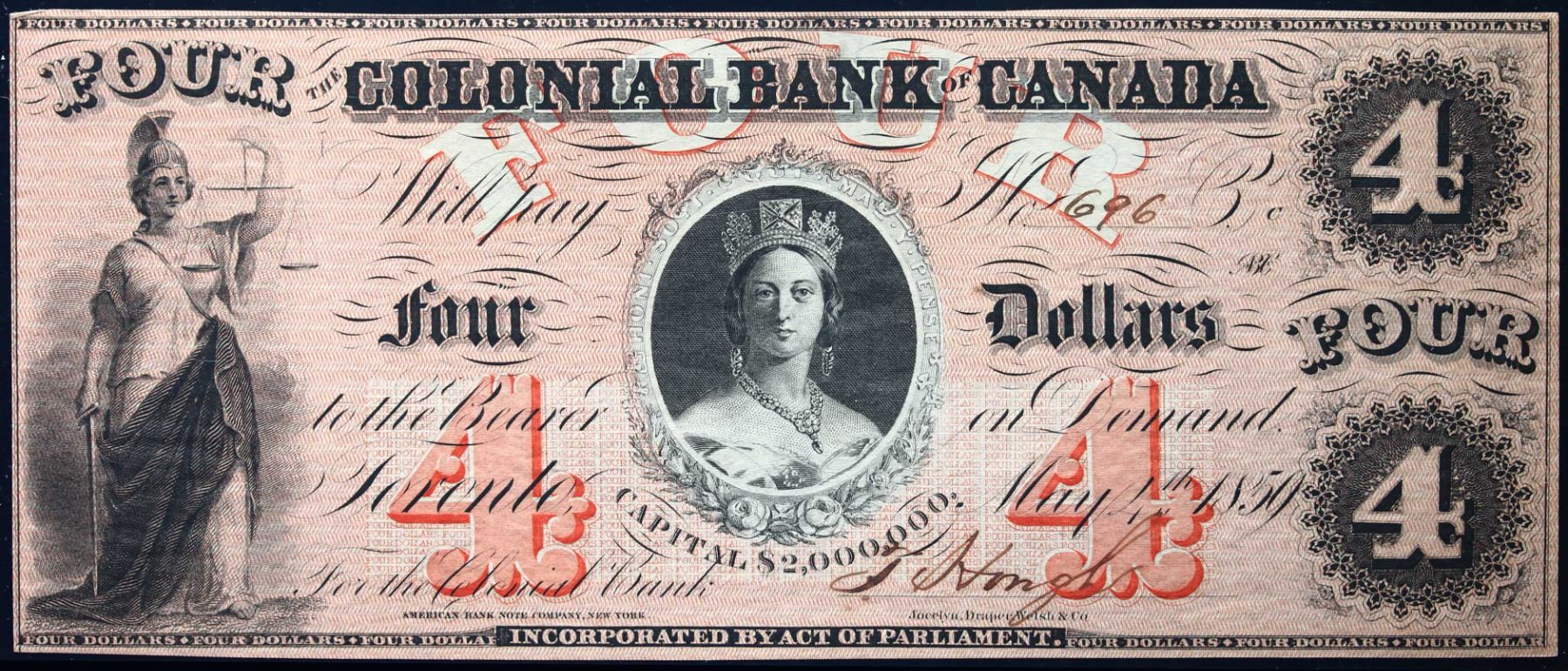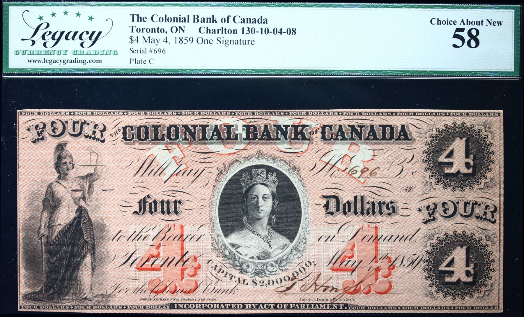 The Colonial Bank of Canada 1859 $4 CH-130-10-04-08 #696 RADAR LCG Choice About Uncirculated-58