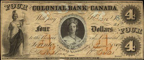 The Colonial Bank of Canada 1859 $4 130-10-02-08 "Two signatures" VF+. A very nice note.