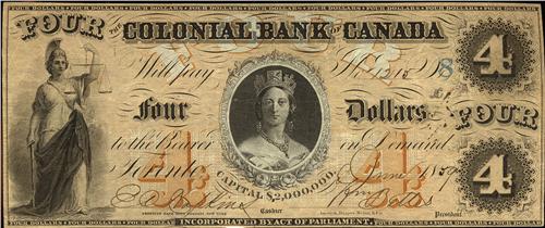 The Colonial Bank of Canada 1859 $4 130-10-02-08 "Two signatures" VF+. A very nice note.
