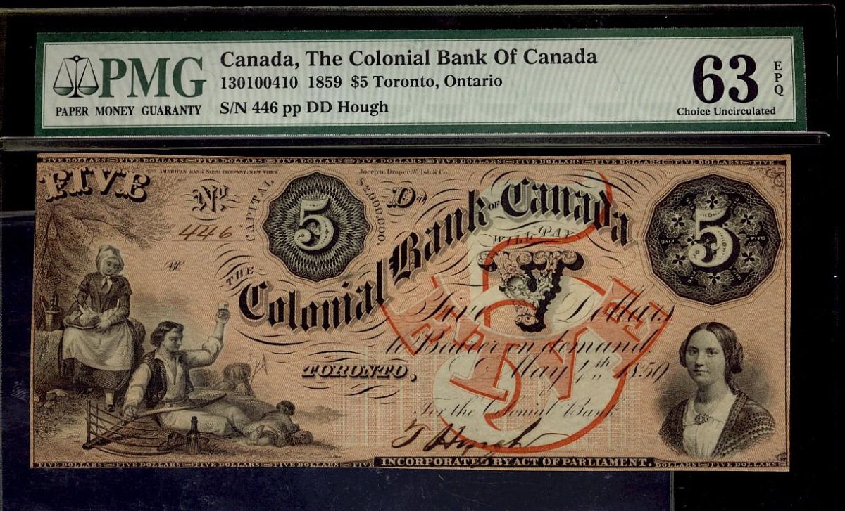The Colonial Bank of Canada 1859 $5 #446 CH-130-10-04-10 PMG CH UNC63.